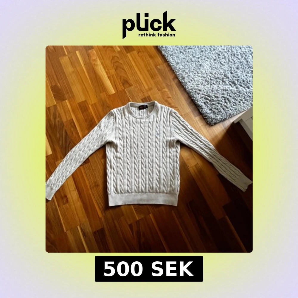 Säljer en klassisk biege kabelstickad tröja från Morris. Tröjan har rund halsringning och långa ärmar med ribbade muddar och nederkant. Perfekt för en stilren och tidlös look. Loggan har lossnat på ett hörn med inget man tänker på