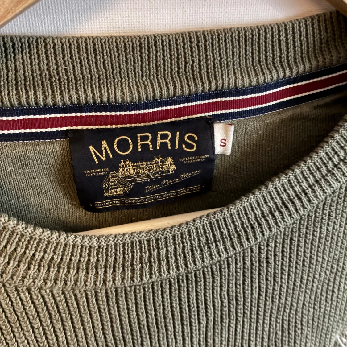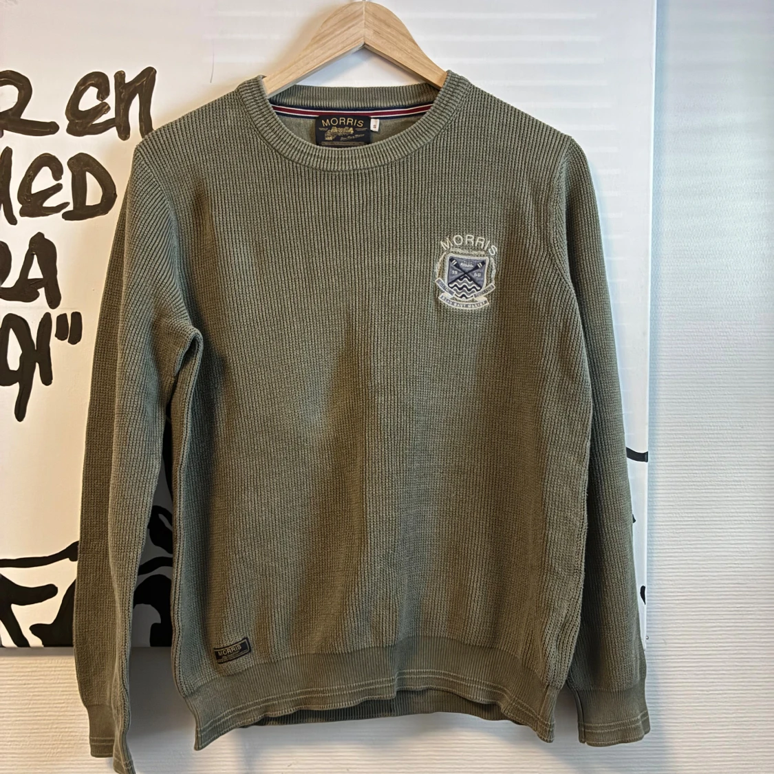 Olivgrön stickad tröja från Morris med broderad logga på bröstet. Tröjan har rund halsringning, ribbade muddar och en klassisk passform. Perfekt för lager-på-lager och snygg till jeans eller chinos. Passar nog även xs.