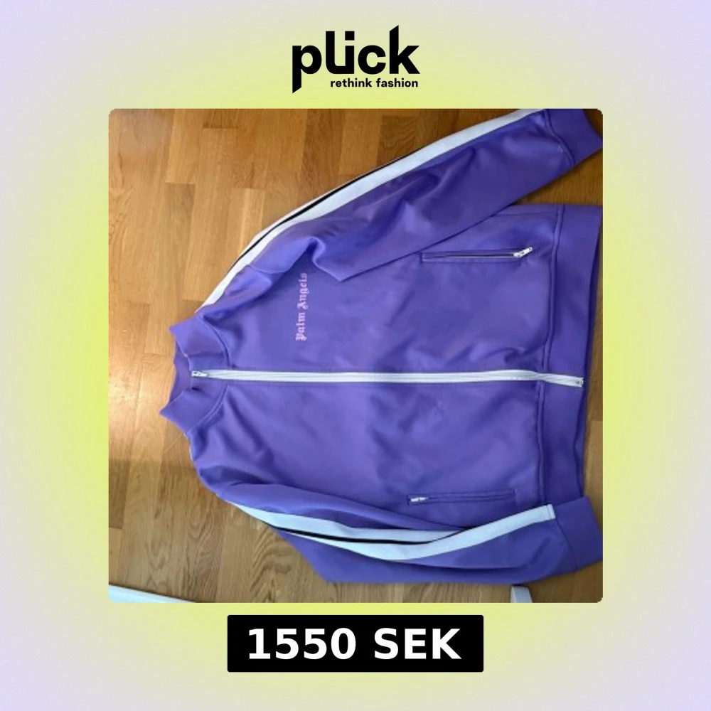 Säljer en lila track jacket från Palm Angels som är vintage med vita ränder längs ärmarna och vit dragkedja. Jackan har ståkrage, två fickor Tveka inte på att höra av dig