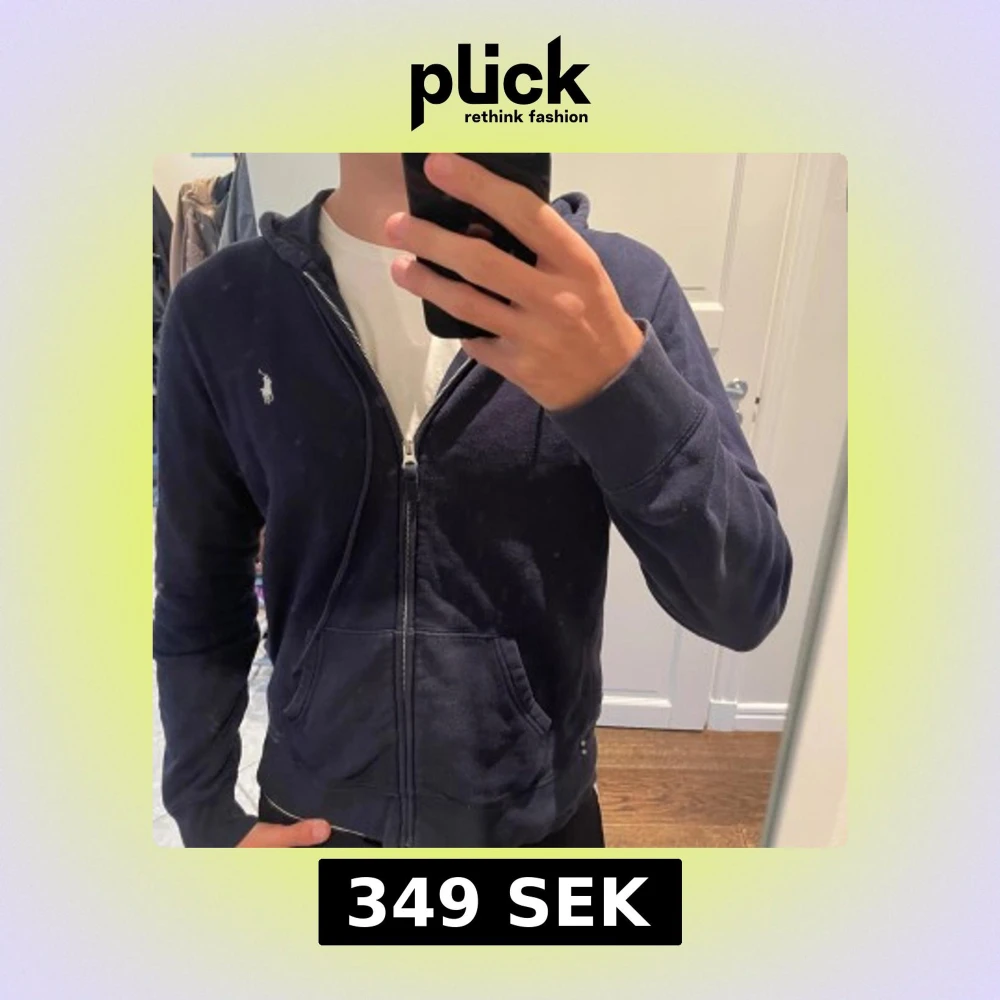 Mörkblå hoodie från Polo Ralph Lauren med dragkedja, huva med snörning och klassisk broderad logga på bröstet. Tröjan har känguruficka framtill och är tillverkad i mjuk bomull. Tröjans storlek lyder XL men har krympt sedan innan jag köpte (2nd hand) och passar S-M