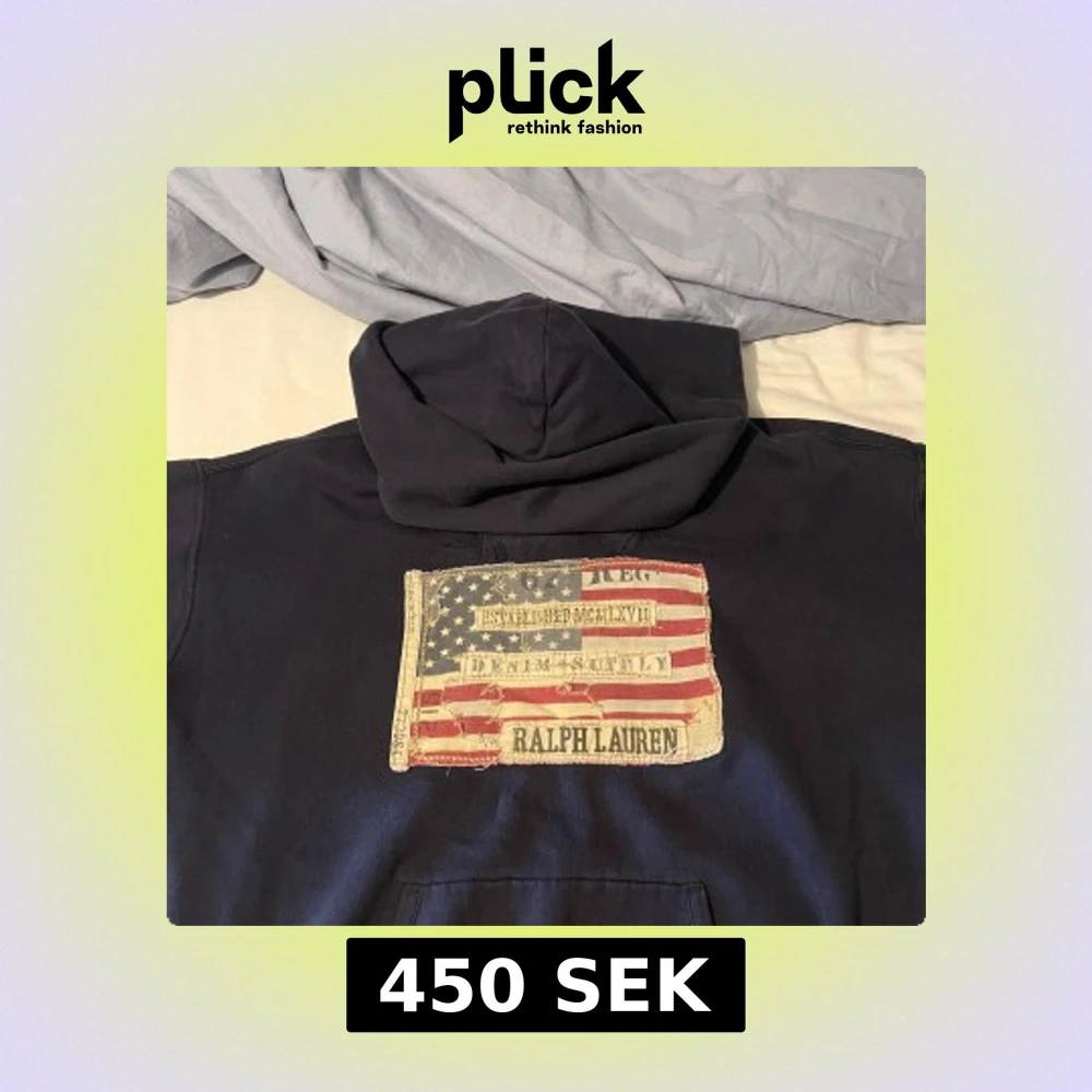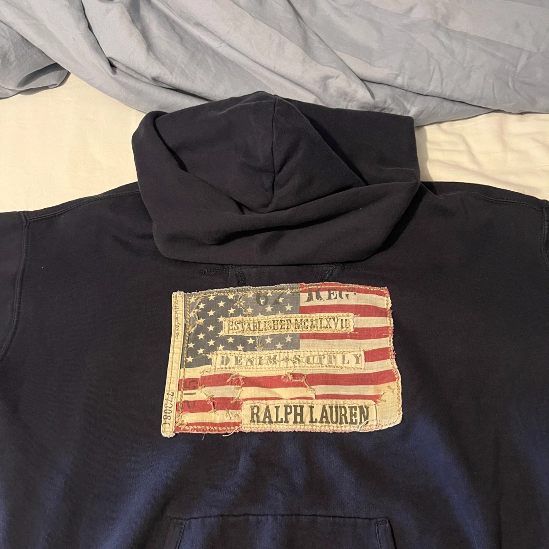 Snygg mörkblå hoodie från Ralph Lauren med stor patch på ryggen som har amerikansk flagga. Har nästan aldrig använt