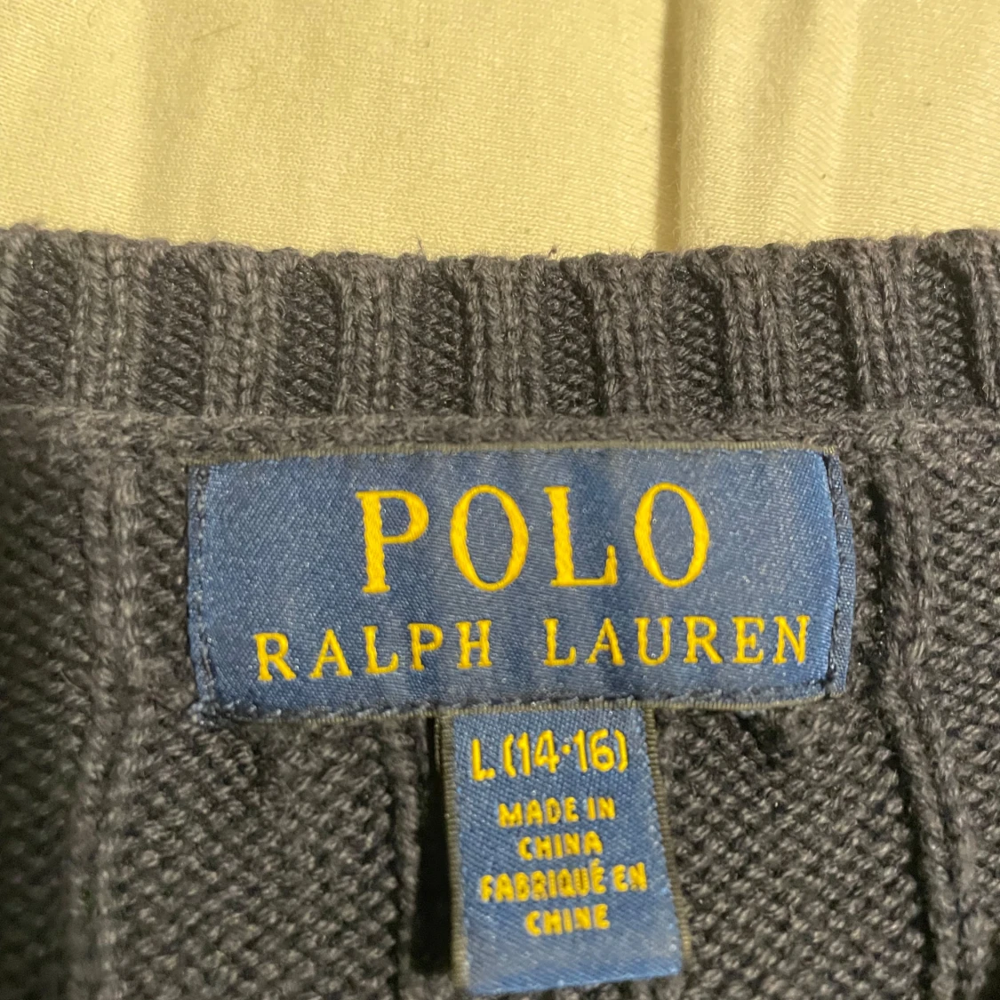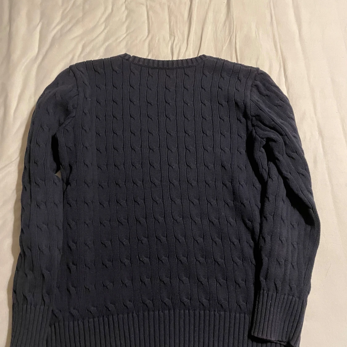 Säljer en stilren mörkblå stickad tröja från Ralph Lauren med kabelstickat mönster. Tröjan har långa ärmar och en liten röd logotyp på bröstet. Perfekt för kyliga dagar. Storlek L för barn, passar som storlek S (herr). Skriv gärna om ni har frågor angående vad som