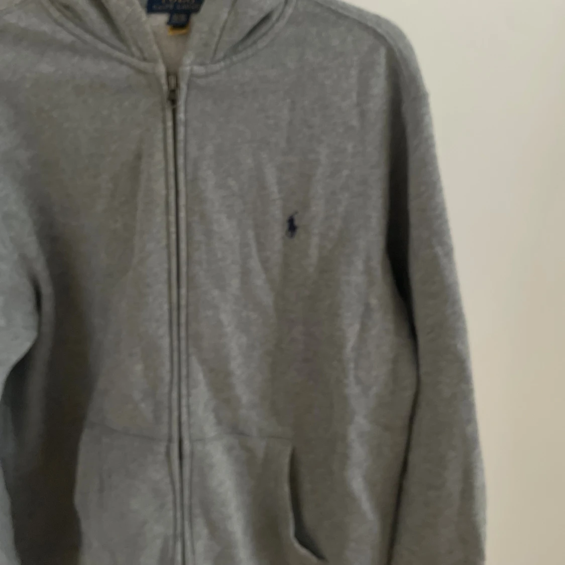 Klassisk grå hoodie från Ralph Lauren med dragkedja framtill och broderad logga på bröstet. Tröjan har huva, långa ärmar och två fickor framtill. Perfekt för en chill och stilren look. Storlek Xl barn passar även s