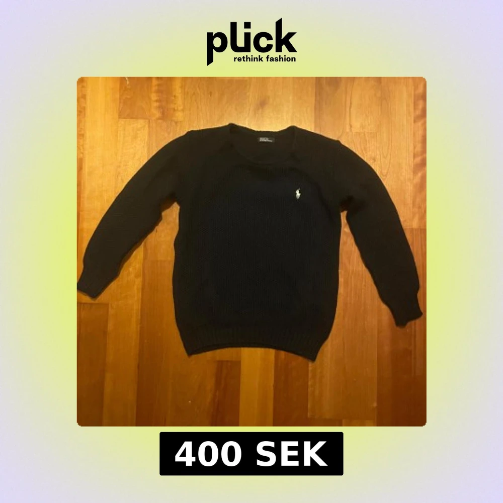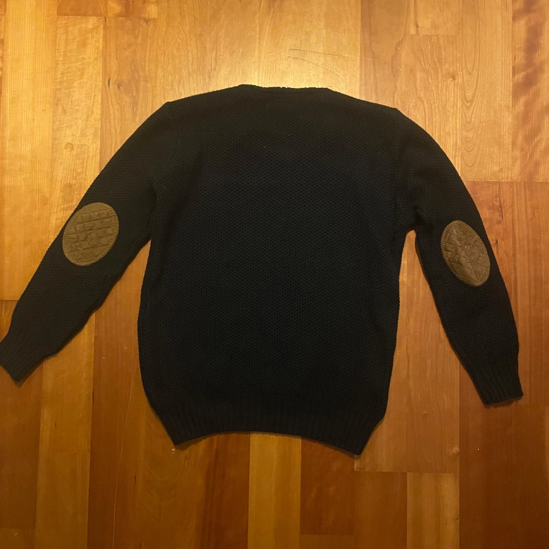 Säljer en stilren svart/mörkblå stickad tröja från Ralph Lauren med bruna armbågslappar. Tröjan har en vit liten broderad logga på bröstet och långa ärmar. Perfekt för kyliga dagar!