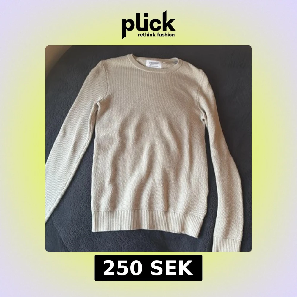 Säljer en stilren beige tröja från Strömberg i ekologisk bomull och återvunnen polyester. Tröjan har en rund hals och långa ärmar med ribbade muddar. Perfekt för en avslappnad look.