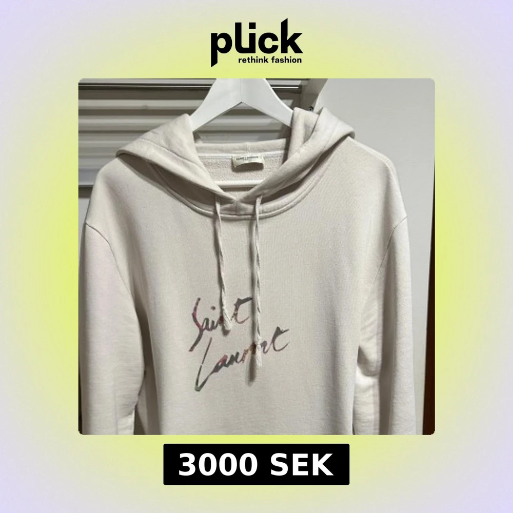 Ordinarie pris 7000kr. Snygg beige hoodie från Saint Laurent med deras ikoniska logga i en färgglad stil på bröstet. Tröjan har en klassisk känguruficka och justerbar huva med dragsko.