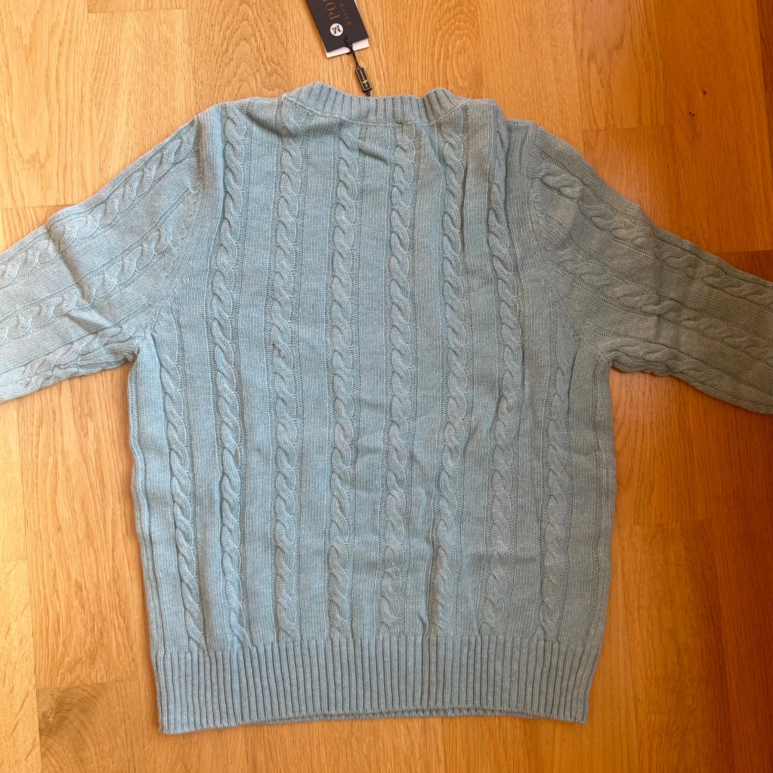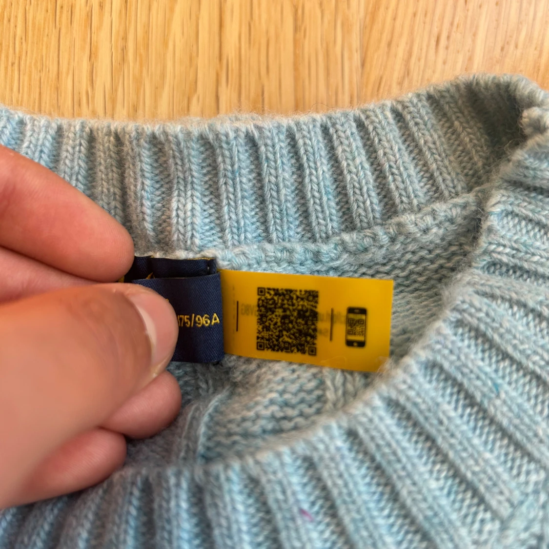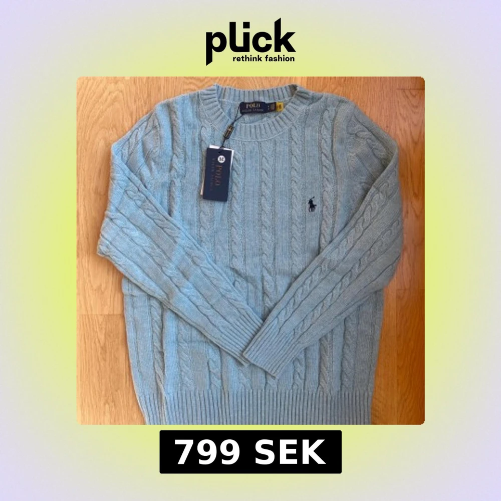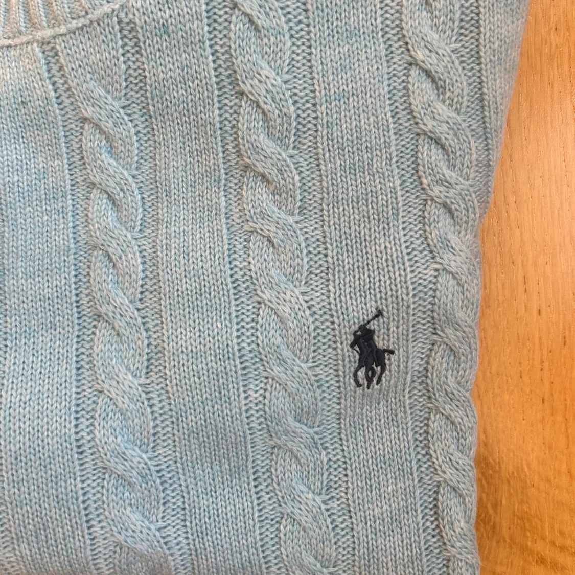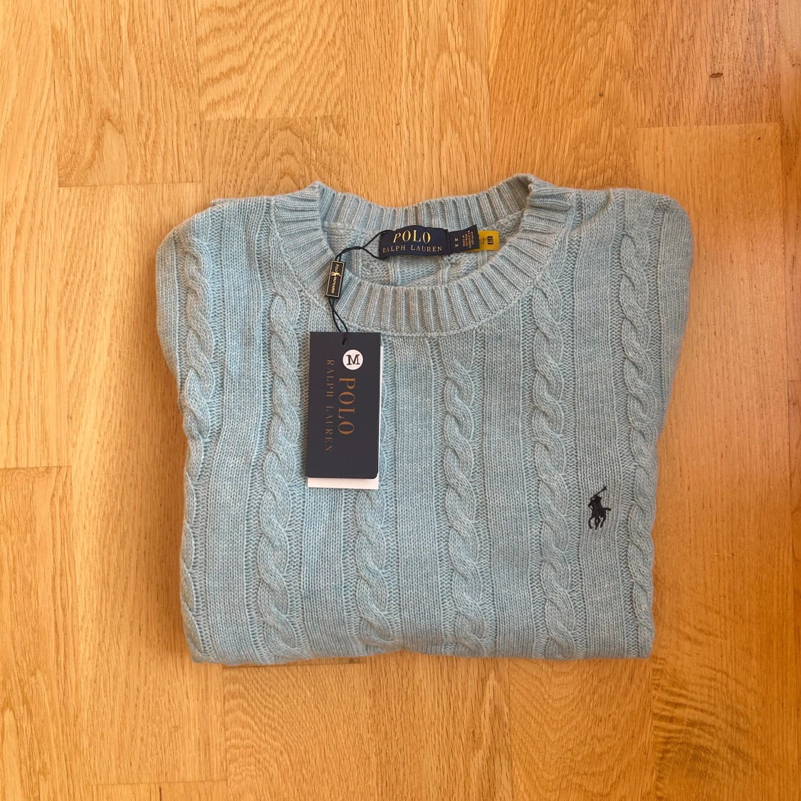 Kabelstickad ljusblå tröja från Polo Ralph Lauren med klassisk rund halsringning och broderad logga på bröstet. Oanvänd, endast testad. Tröjan har långa ärmar och ribbade muddar vid ärmslut och nederkant. Perfekt för lager-på-lager under kyliga dagar. Passar till allt. Nypris: 2000kr