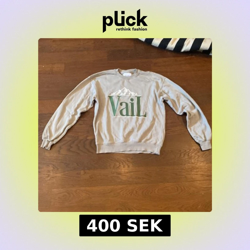 Säljer en grå swetshirt med grönt Vail-tryck och bergmotiv på bröstet. Tröjan har rund hals, långa ärmar och ribbade muddar vid ärmslut och nederkant. Perfekt för chill dagar eller när du vill ha en clean look.