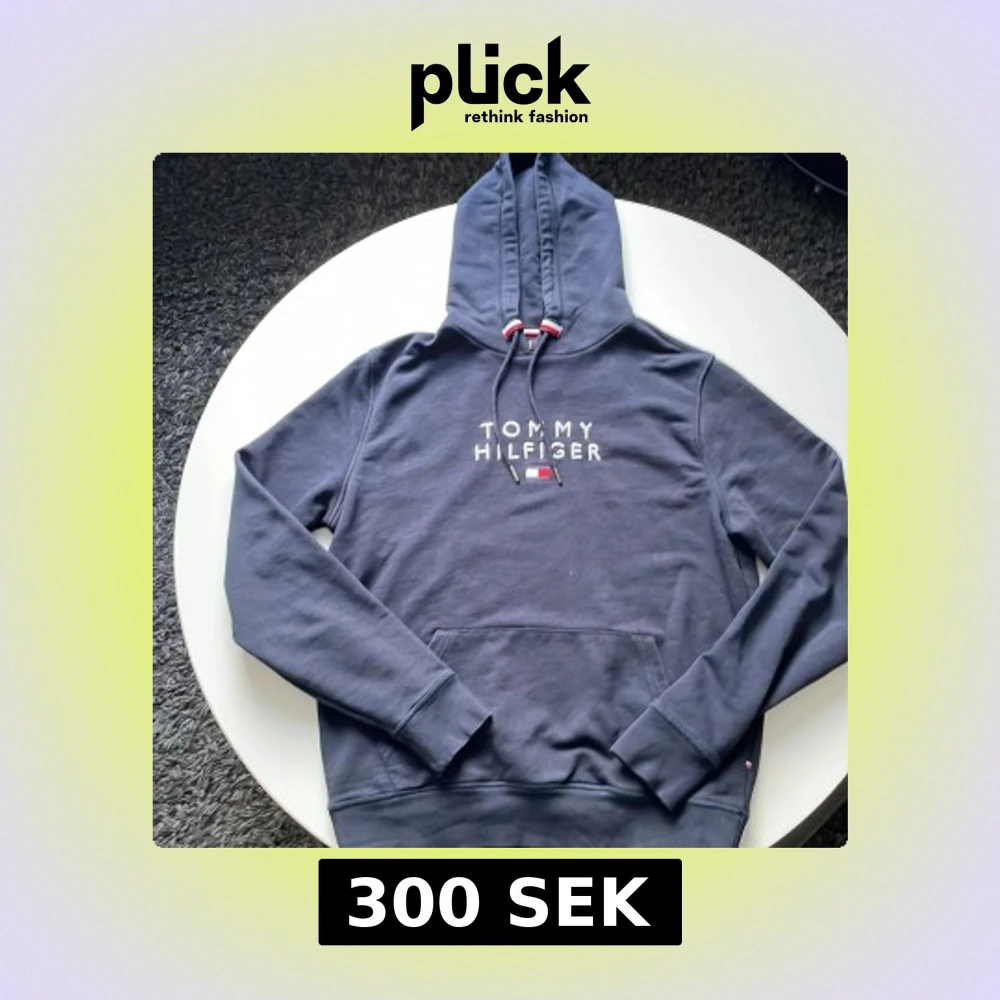 Snygg mörkblå hoodie från Tommy Hilfiger i ekologisk bomull. Tröjan har huva med snörning, klassisk logotyp broderad på bröstet och en stor magficka. Ribbade muddar och detaljer i rött, vitt och blått på snören och insidan av huvan.