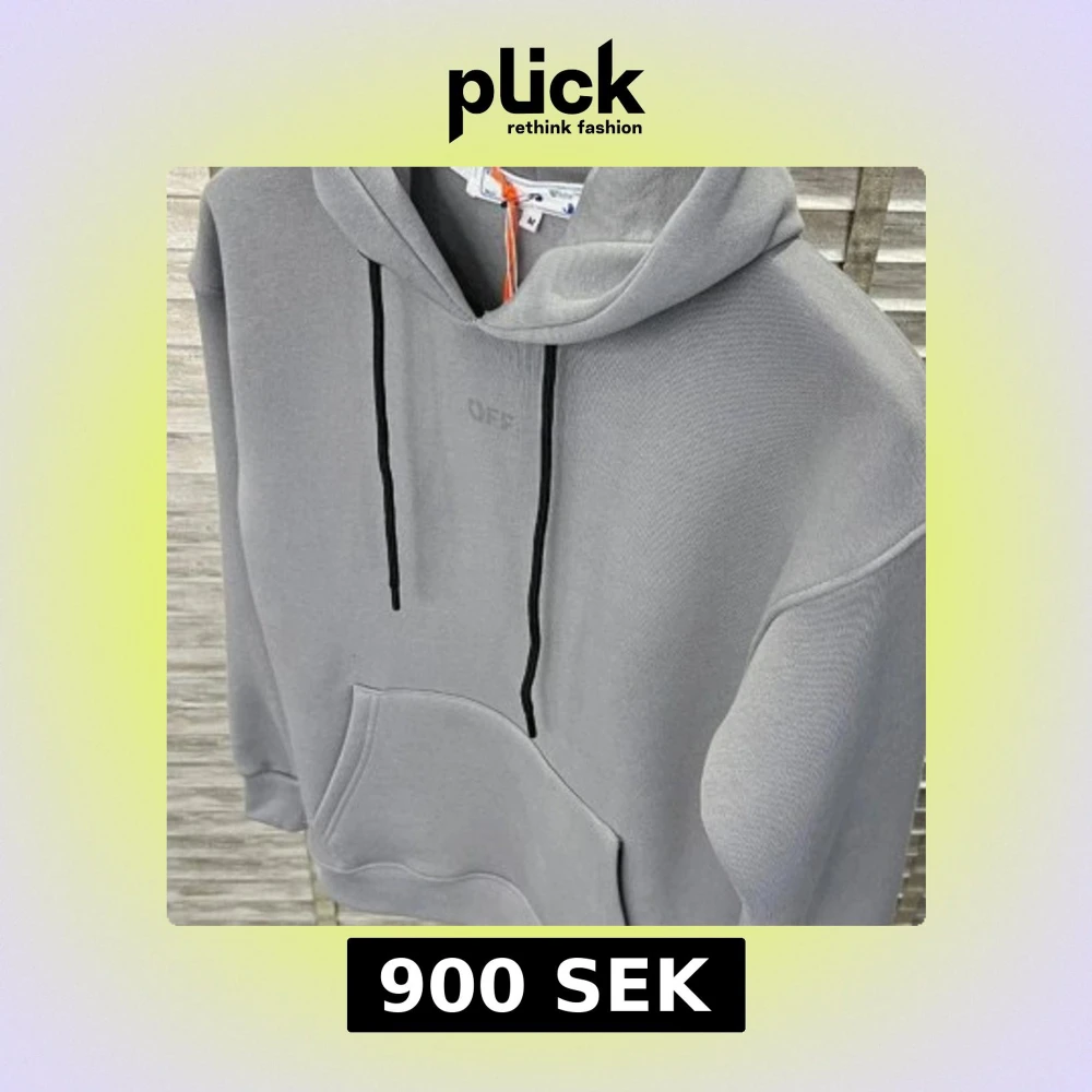 Snygg grå hoodie från Off-White med svart dragsko och stor ficka framtill. Baksidan pryds av det ikoniska Off-White-mönstret i ljusare grått. Perfekt för en stilren och avslappnad look.