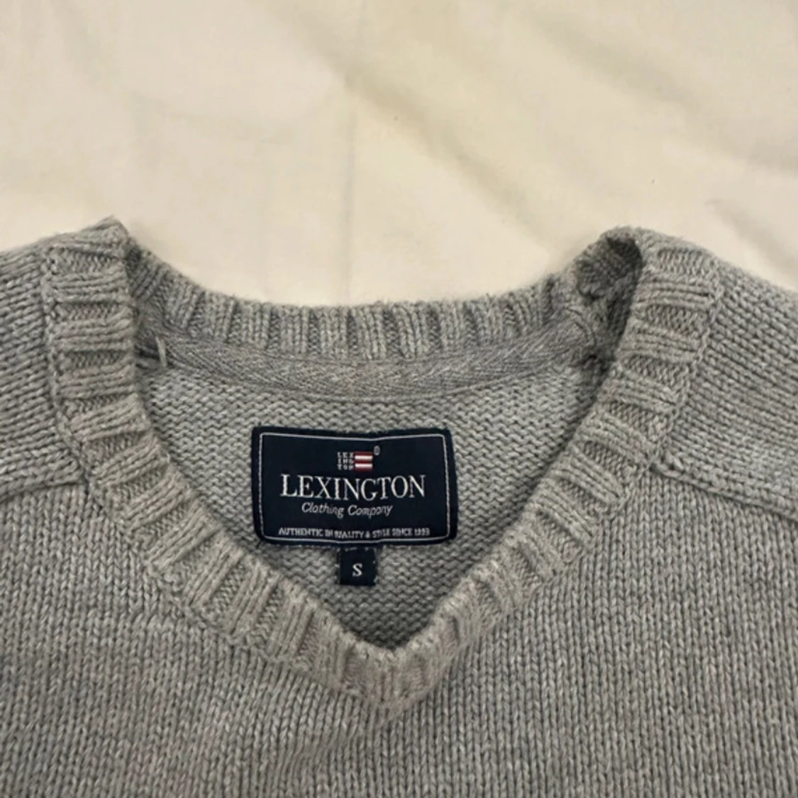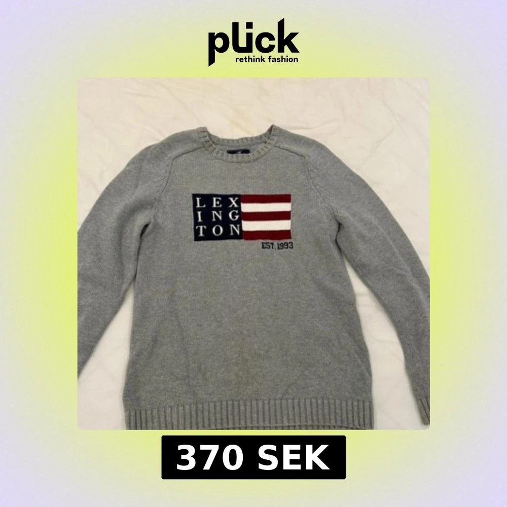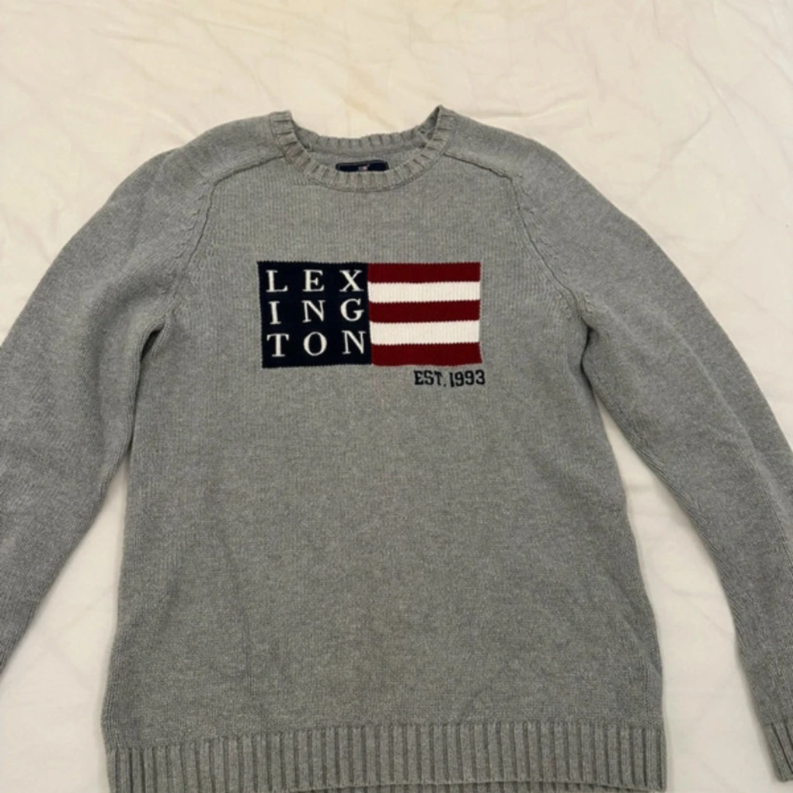 Säljer en stilren grå tröja från Lexington med ett broderat märke på bröstet i blått, rött och vitt. Tröjan har långa ärmar och ribbade kanter vid hals, ärmslut och nederkant. Perfekt för en avslappnad och klassisk look.