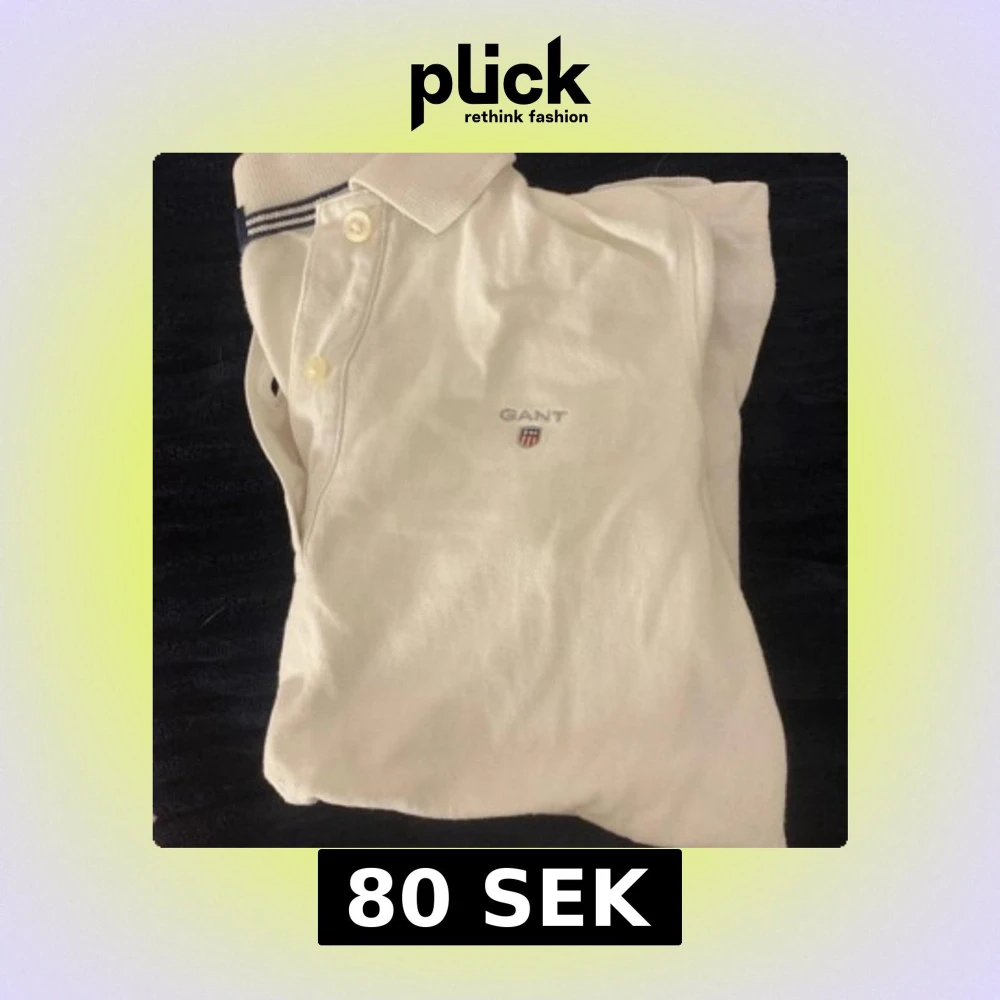 Säljer en klassisk vit pikétröja från GANT med korta ärmar och knappar framtill. Tröjan har en broderad logotyp på bröstet och en stilren krage med randiga detaljer. Köpte den secondhand men passade inte riktigt så säljer den vidare nu.