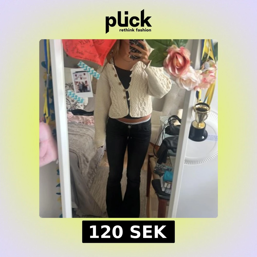 Superfin beige stickad kofta med snyggt flätmönster och träknappar. Koftan är croppad och har lång ärm, perfekt att slänga över ett linne. Mysig och trendig stil som passar till jeans eller kjol.