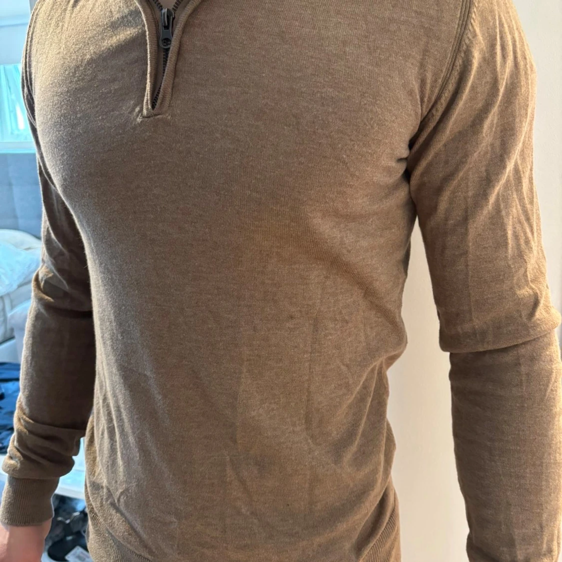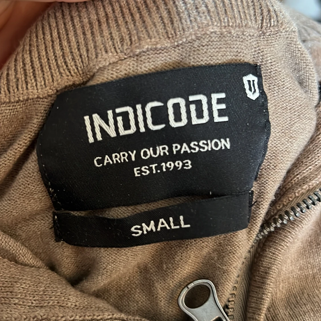Säljer en brun/beige långärmad tröja från Indicode i storlek small. Tröjan har en snygg half zip-dragkedja vid halsen och är tillverkad i mjukt material. Perfekt för lager-på-lager och chill stil.