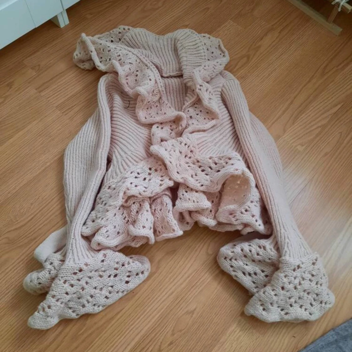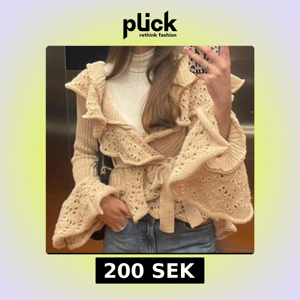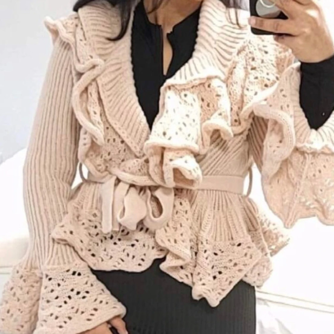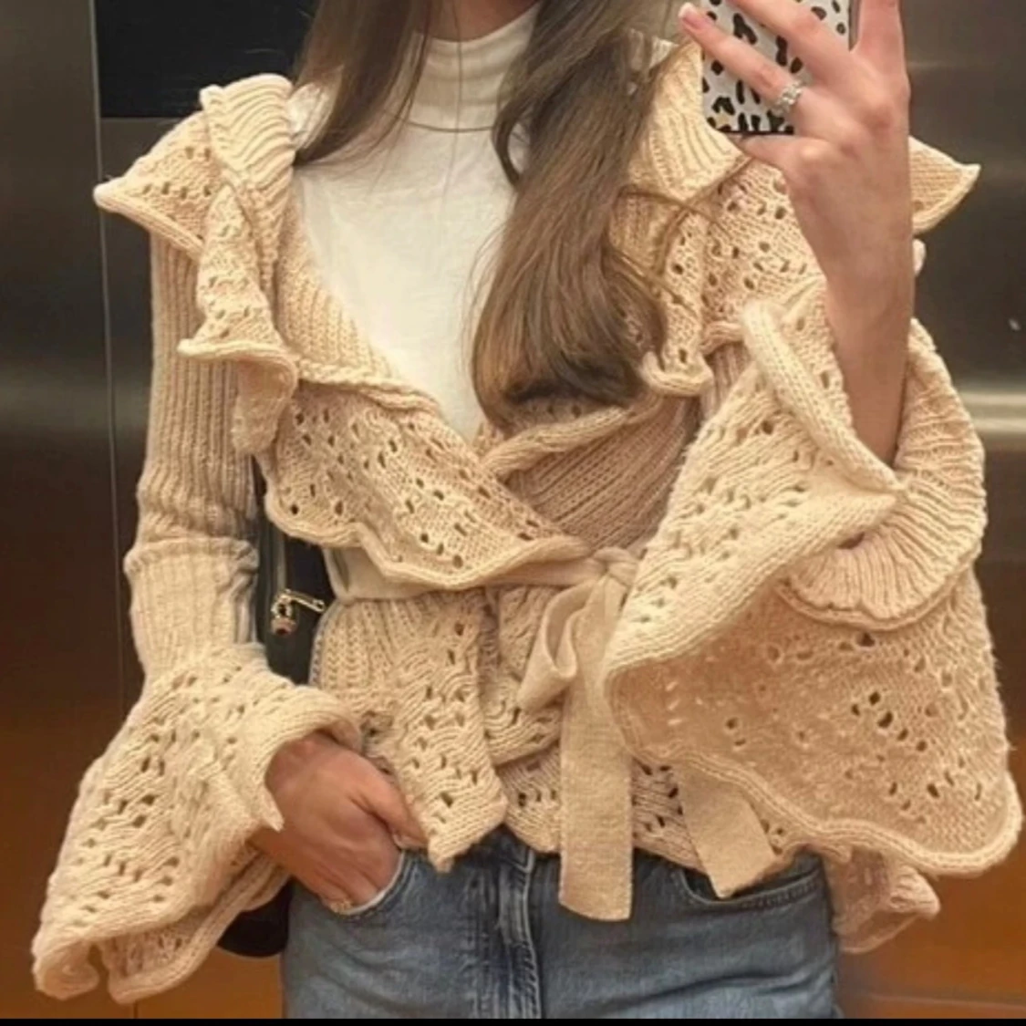 Superfin beige stickad kofta med breda volangdetaljer och knytband i midjan. Koftan har långärmade ärmar med extra volym och hålstickat dekorativt mönster. Storlek XS