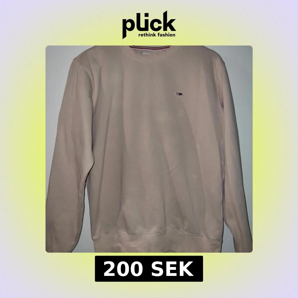 Säljer en stilren beige tröja från Tommy Jeans. Tröjan har en liten logotyp på bröstet och är tillverkad i ett mjukt material. Perfekt för en avslappnad look.