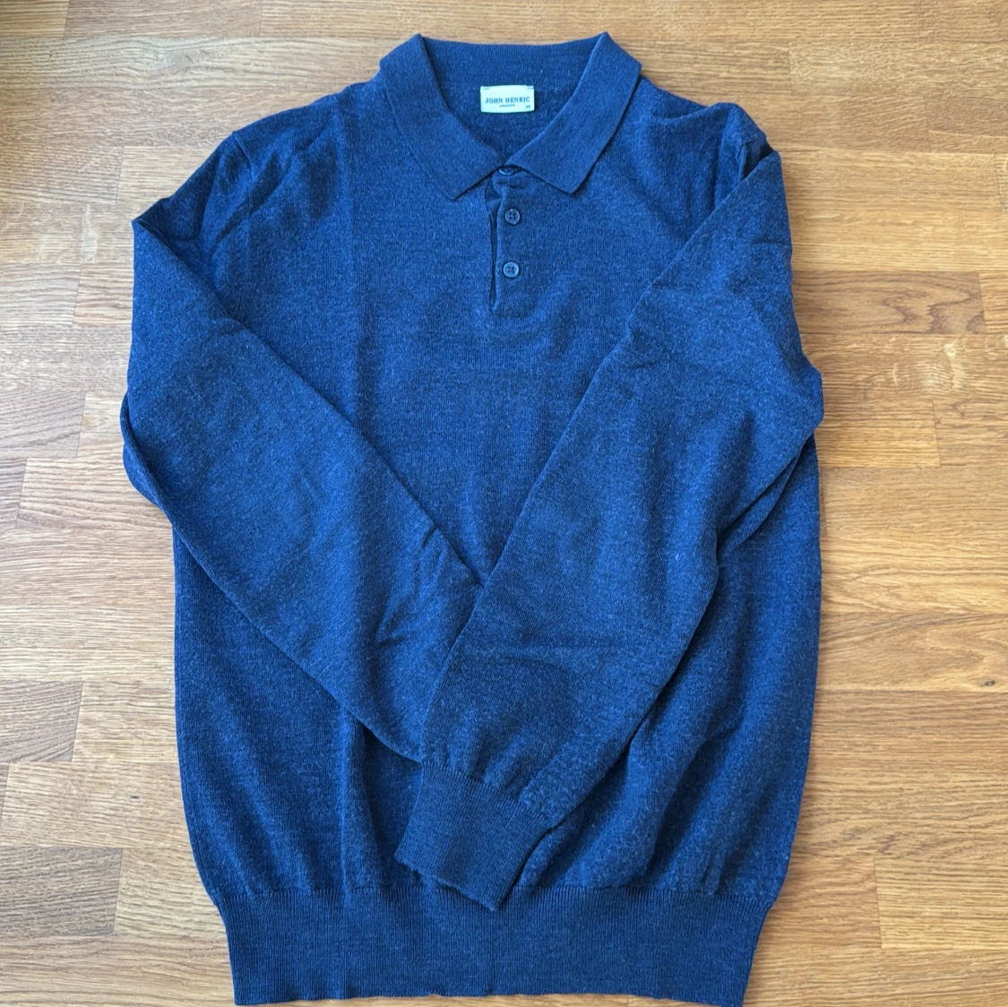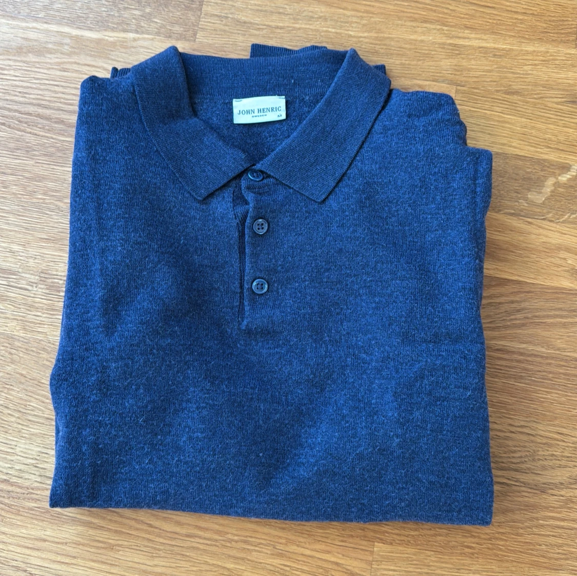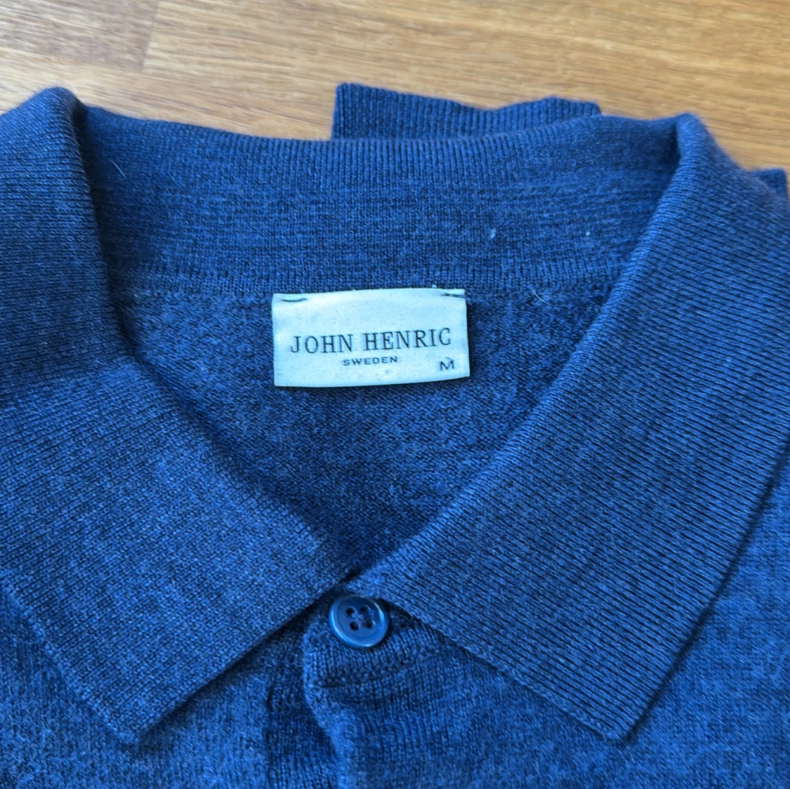 Säljer en marinblå stickad pikétröja från John Henric. Tröjan har klassisk krage, tre knappar framtill och långa ärmar. Perfekt för dig som gillar en stilren och tidlös look. Materialet är mjukt och skönt mot huden.