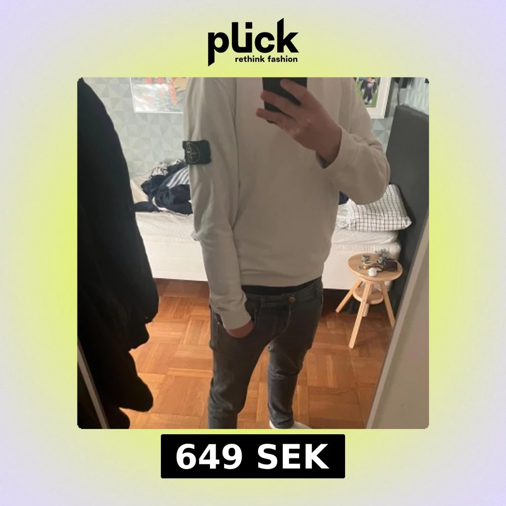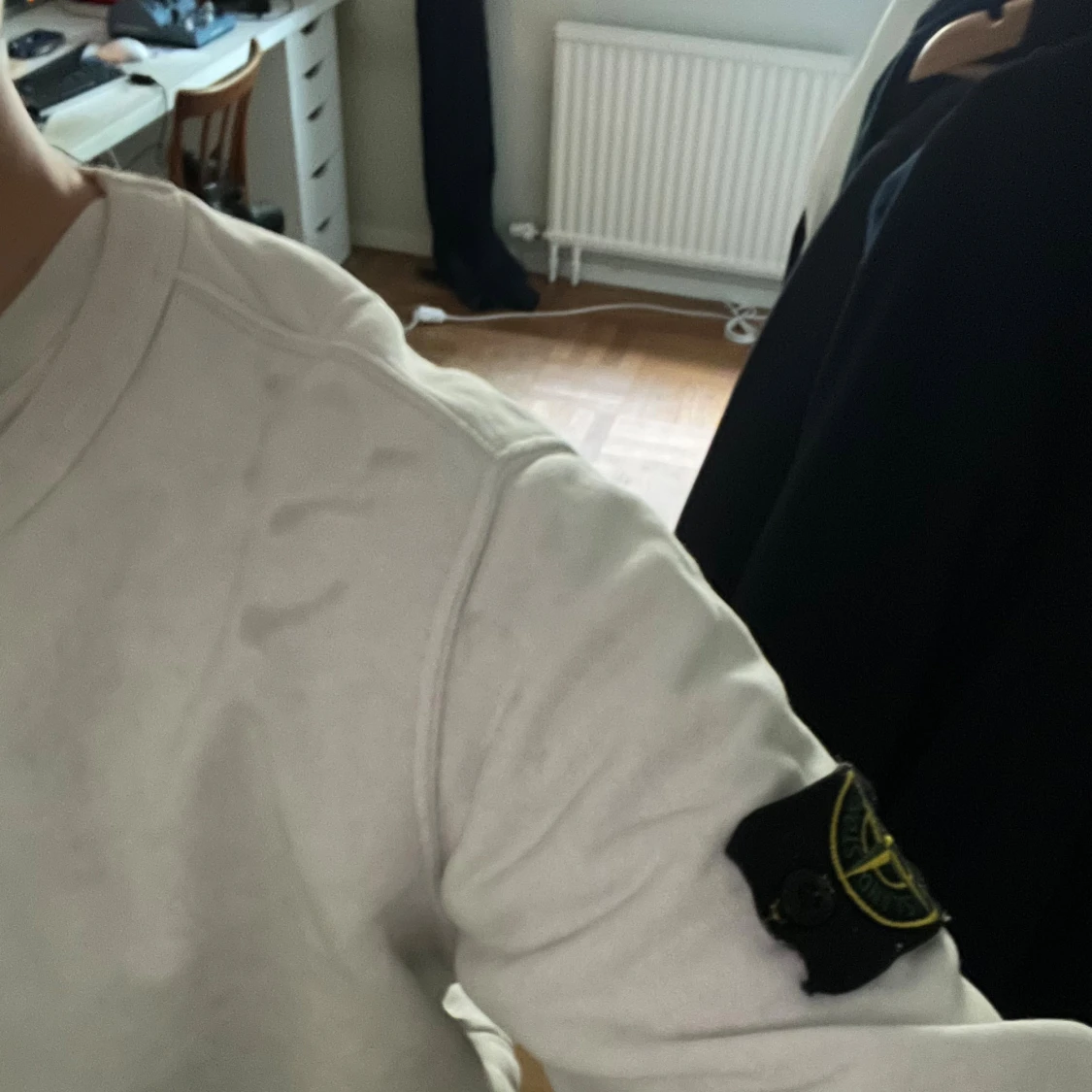 Vit sweatshirt från Stone Island med klassisk rund hals och ikonisk logga på vänster ärm. Tröjan har en clean look med ribbade muddar och är tillverkad i mjuk bomull. Liten färg defekt på axeln. Storlek M passar även S. Kom gärna med prisförslag till denna!✌️