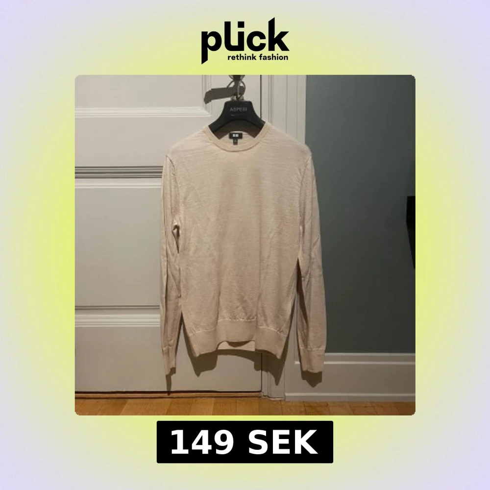 Snygg beige stickad tröja från Uniqlo i storlek S. Tröjan har rund hals och långa ärmar med ribbade muddar vid hals, ärmslut och nederkant. Perfekt för lager-på-lager och enkel att matcha med jeans eller chinos.