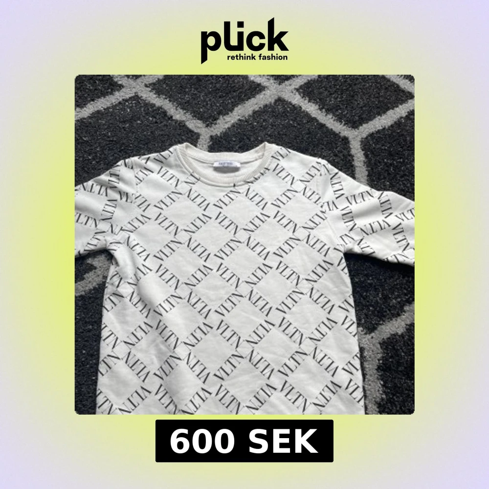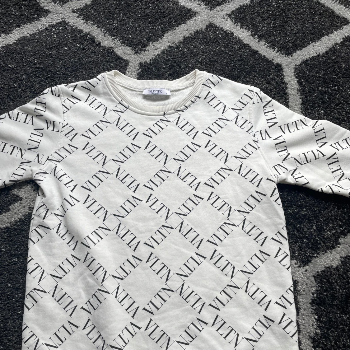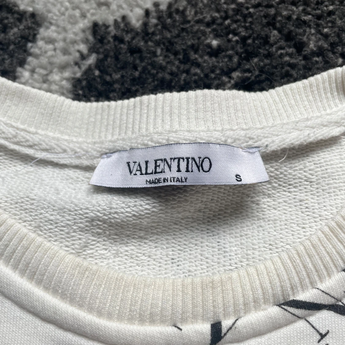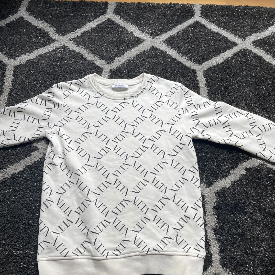 Säljer en stilren vit tröja från Valentino med ett elegant mönster av logotypen över hela plagget. Tröjan har långa ärmar och en rund halsringning. Perfekt för en trendig look. Köpt från farfetch 2022 men har varit för liten så har inte kunnat ha på mig tröjan. Den har en liten söm som är öppen vid kragen därför jag säljer den för så bra pris. Skriv för mer info om intresserad😁 storlek s men passar xs