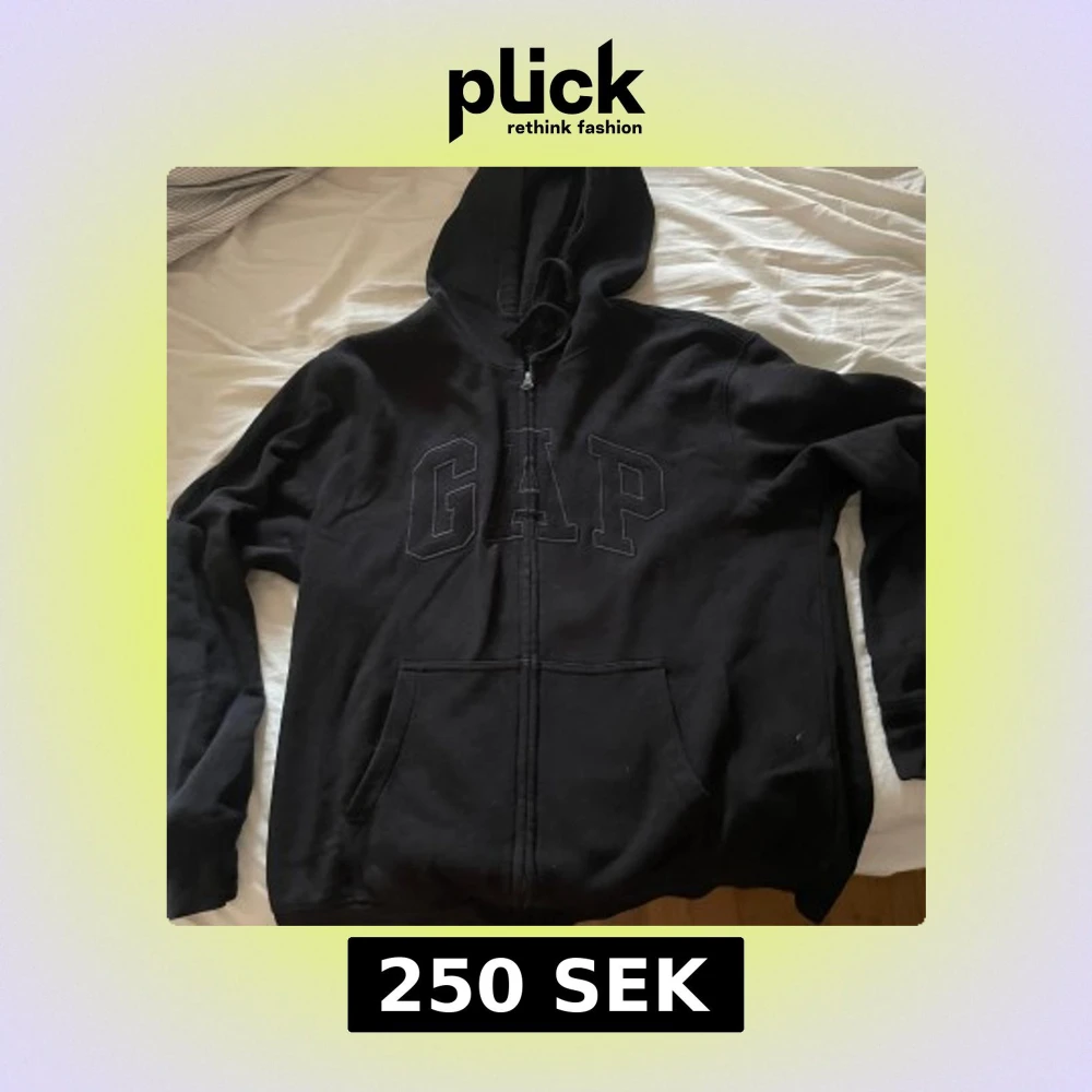 Säljer en svart hoodie från GAP med dragkedja och stor logga på bröstet. Tillverkad i en mjuk blandning av bomull och polyester. Perfekt för en avslappnad stil.
