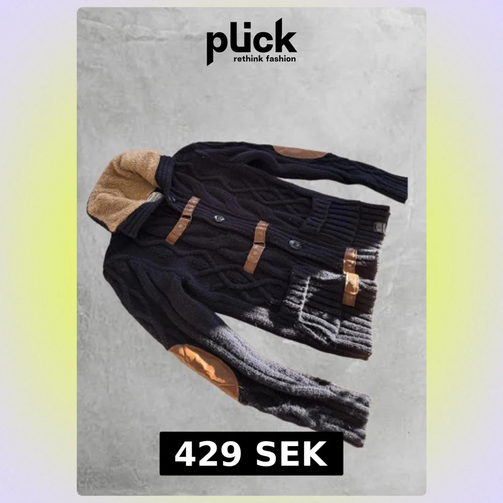 Mörkblå stickad fur cardigan från Tazzio med grov kabelstickning, bruna detaljer i skinn på armbågar och knäppning, samt mjuk beige teddyfleece i kragen. Jackan har stora fickor och både knappar och spännen framtill. Perfekt för kalla dagar.