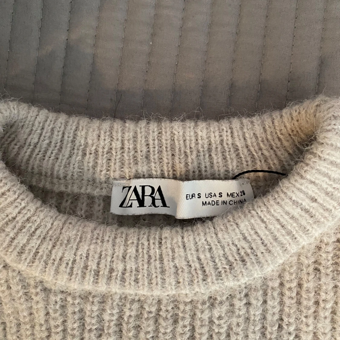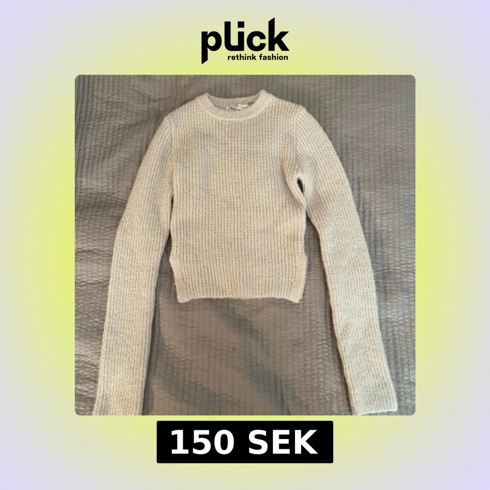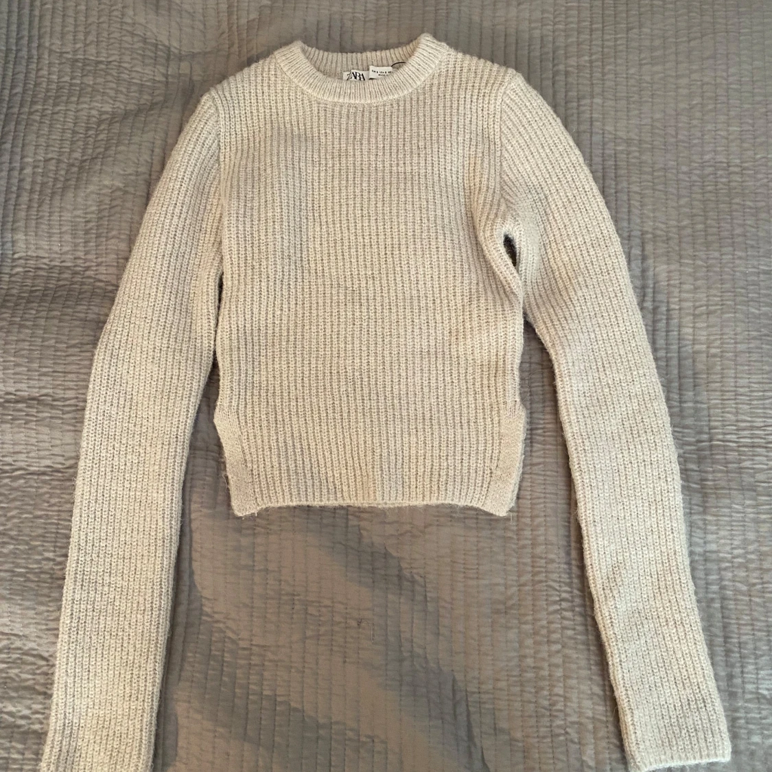 Säljer en stilren beige stickad tröja från Zara. Tröjan har en croppad passform och långa ärmar, perfekt för kyligare dagar. Den är mjuk och bekväm, idealisk för både vardag och avslappnade tillfällen.