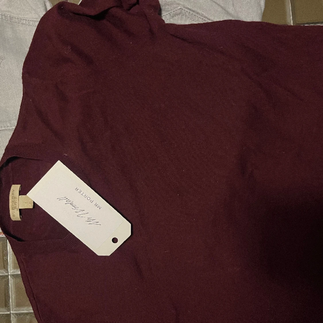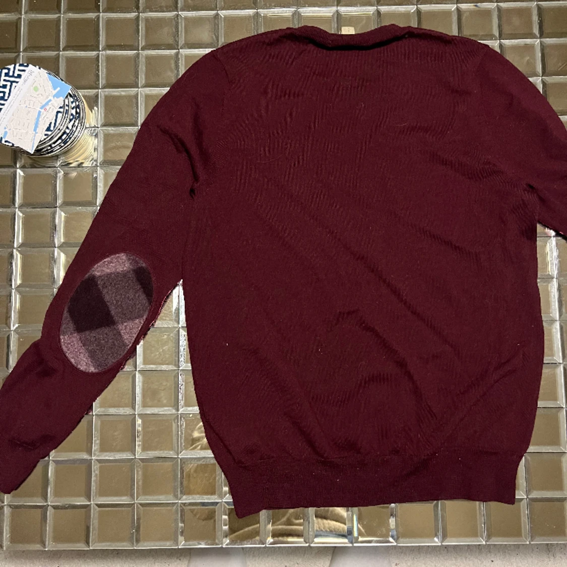 Burberry vinröd tröja med mönstret på armbågarna. Storlek S, nypris 4k+. 100% Merino ull, super mjuk.