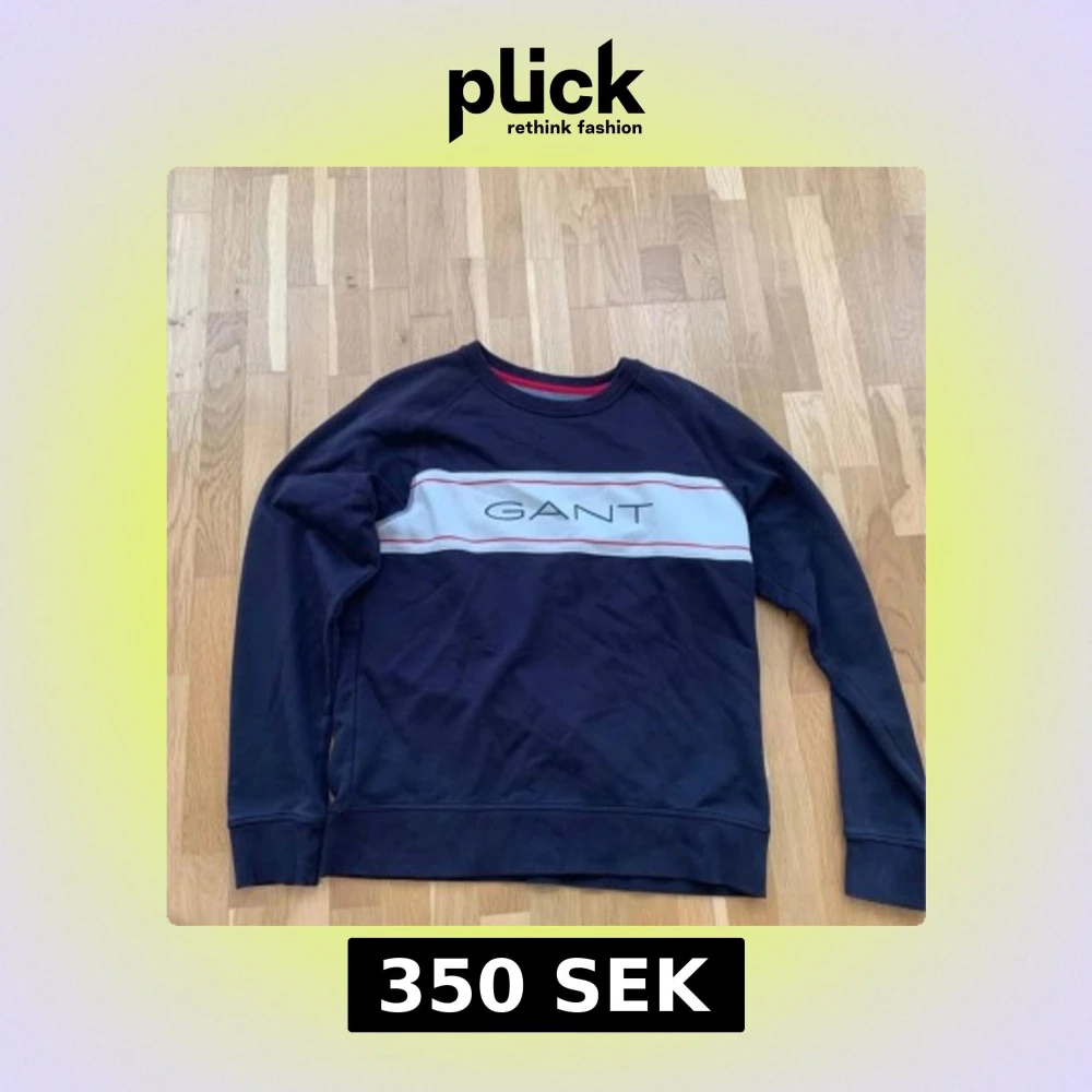 Säljer en mörkblå sweatshirt från GANT med vit och röd rand över bröstet och stor GANT-logga. Tröjan har rund halsringning och långa ärmar. Perfekt för dig som gillar klassisk och stilren streetwear.