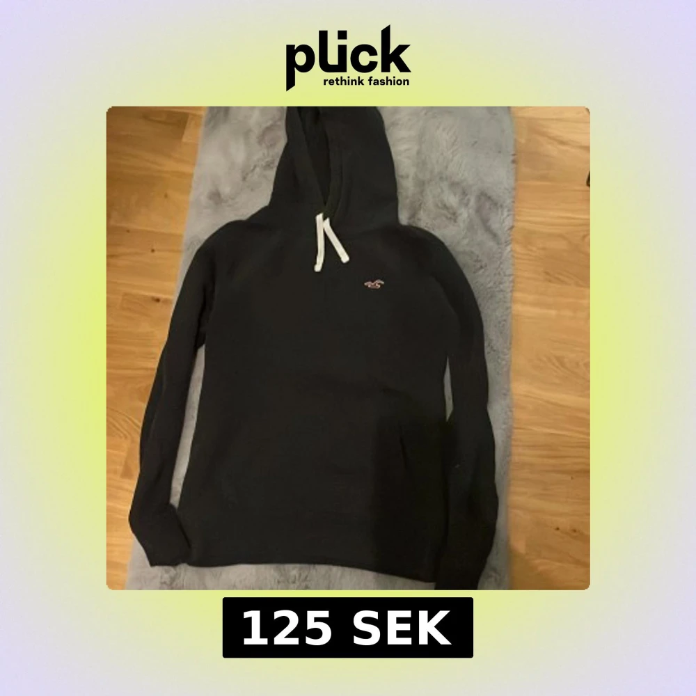 Svart hoodie från Hollister i storlek M med klassisk huva och vit snörning. Perfekt för chill dagar och enkel att matcha med jeans eller joggers.