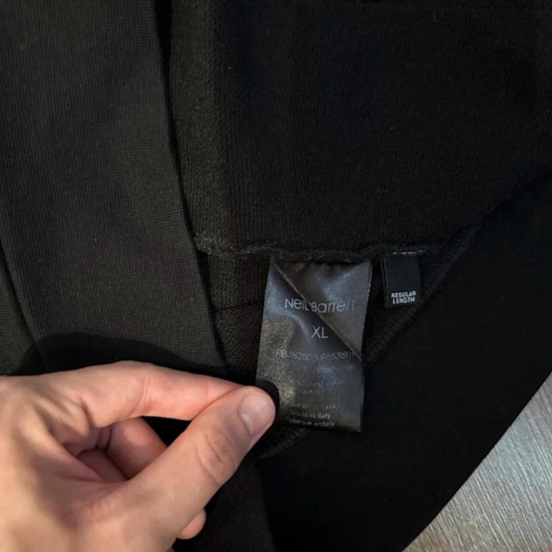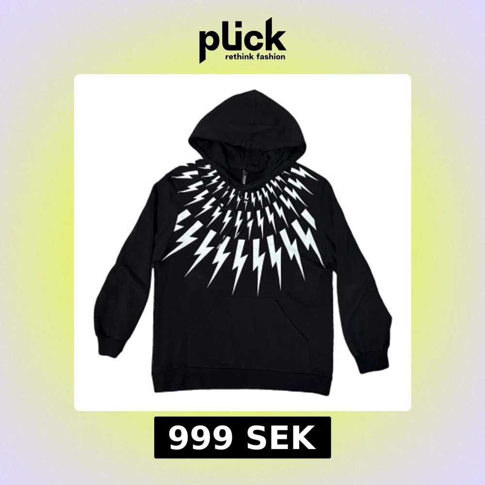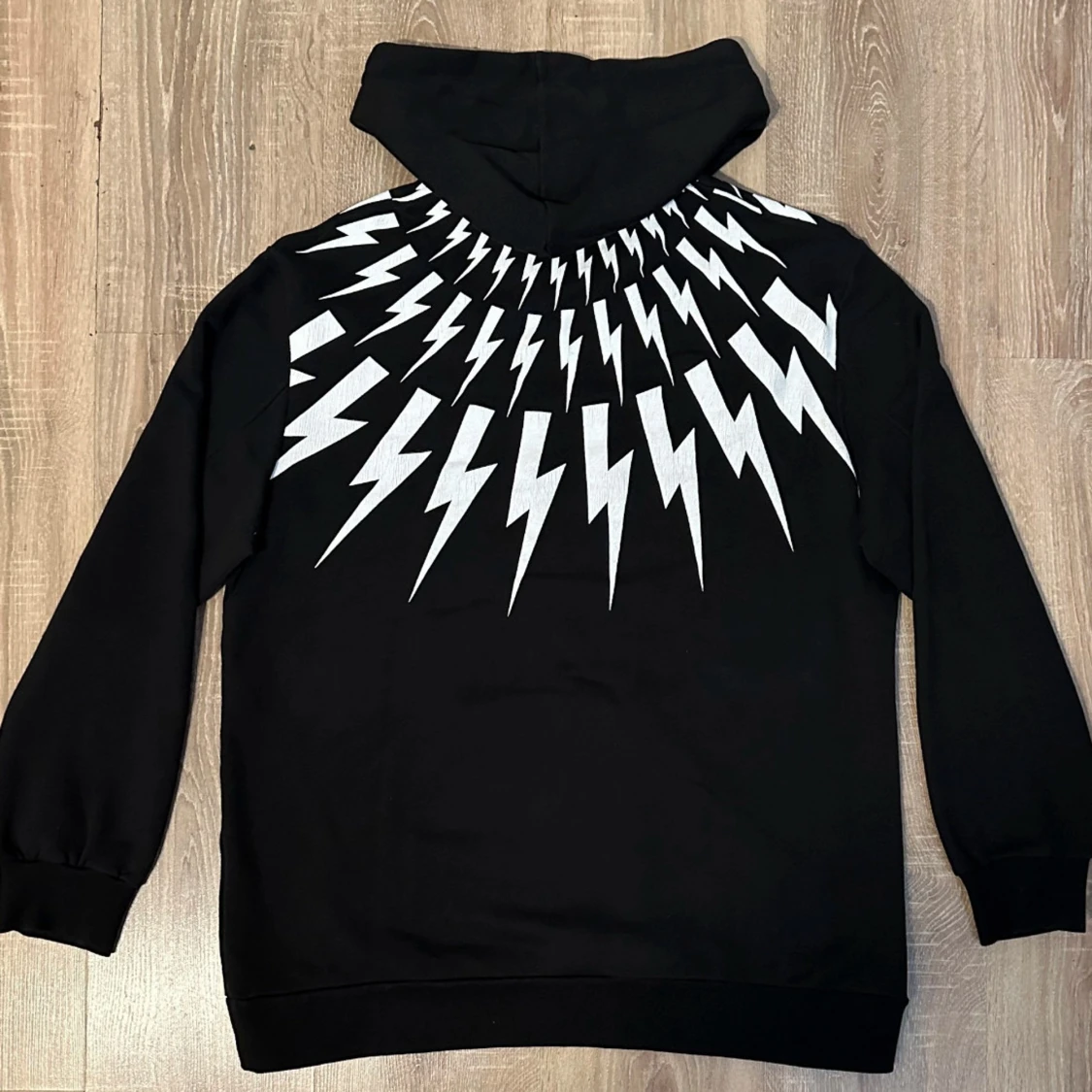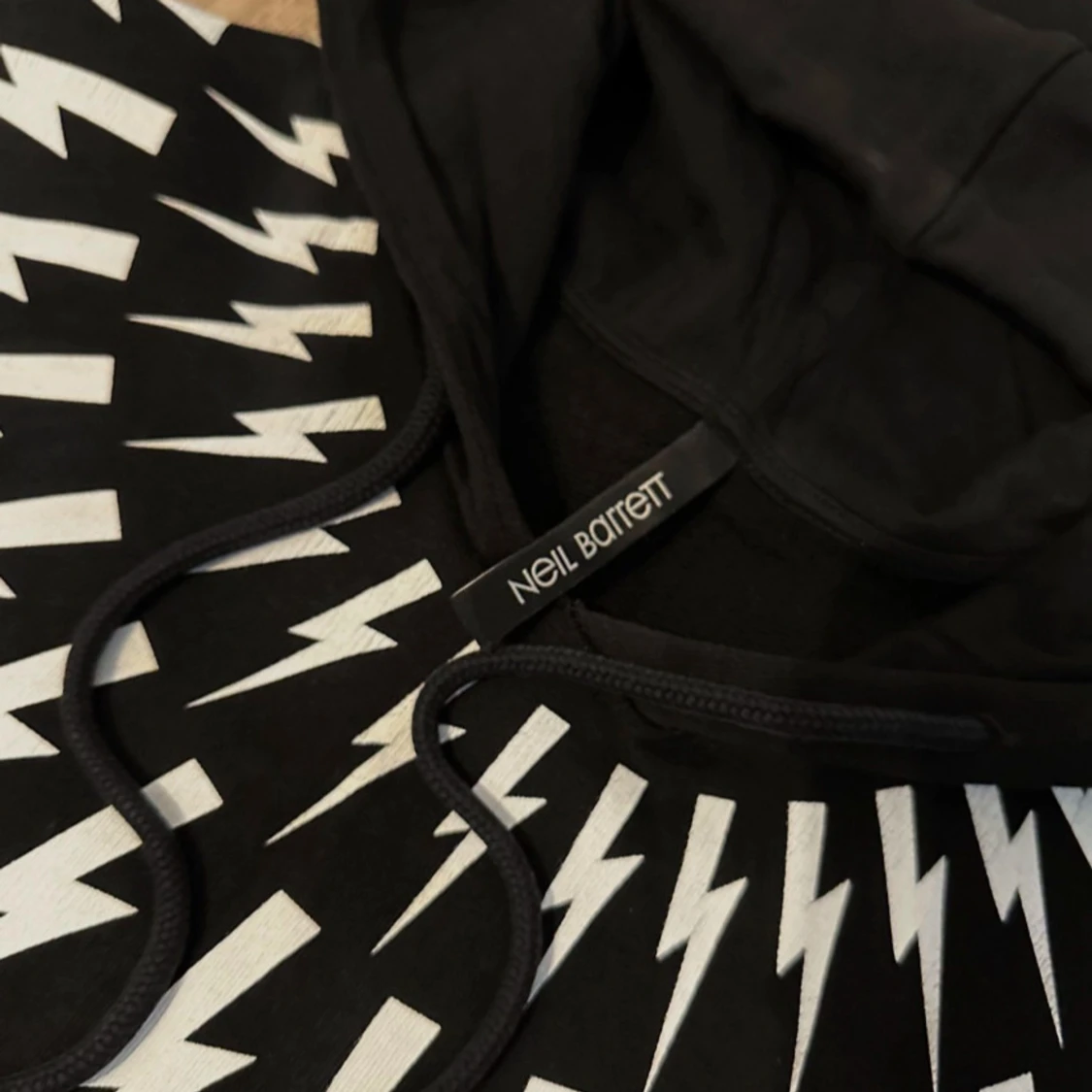 Svart hoodie från Neil Barrett med ikoniskt vitt blixtmönster runt halsen, både fram och bak. Org pris runt 4500kr! Tröjan har huva med snörning och en stor magficka. Tillverkad i mjuk bomull för maximal komfort och streetkänsla.