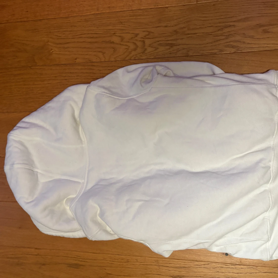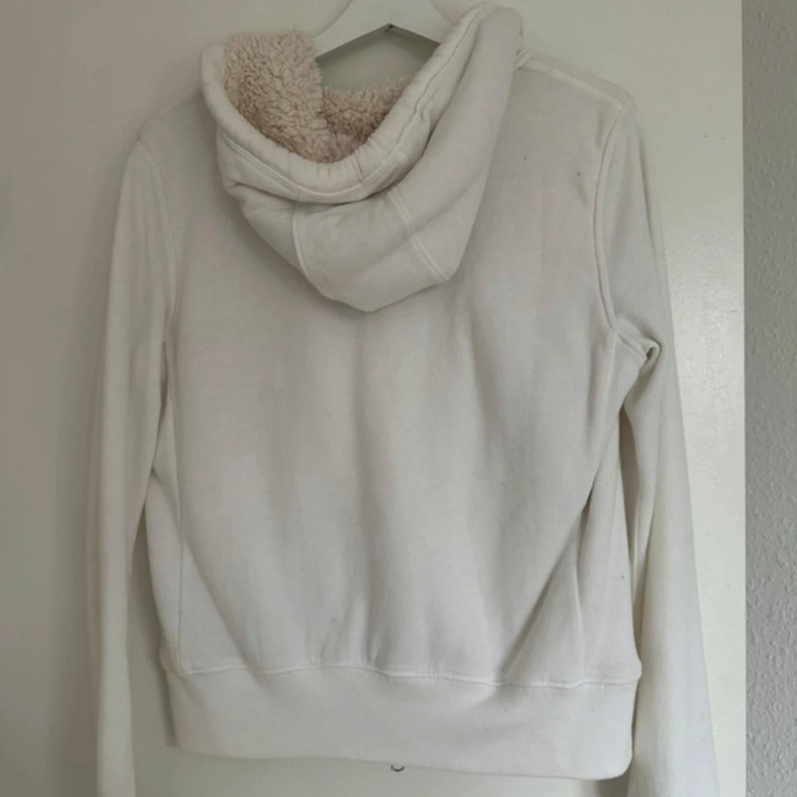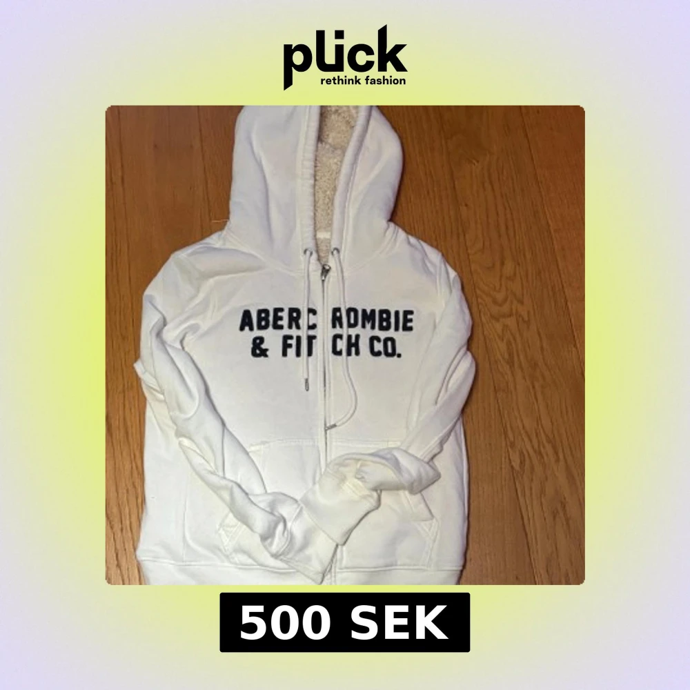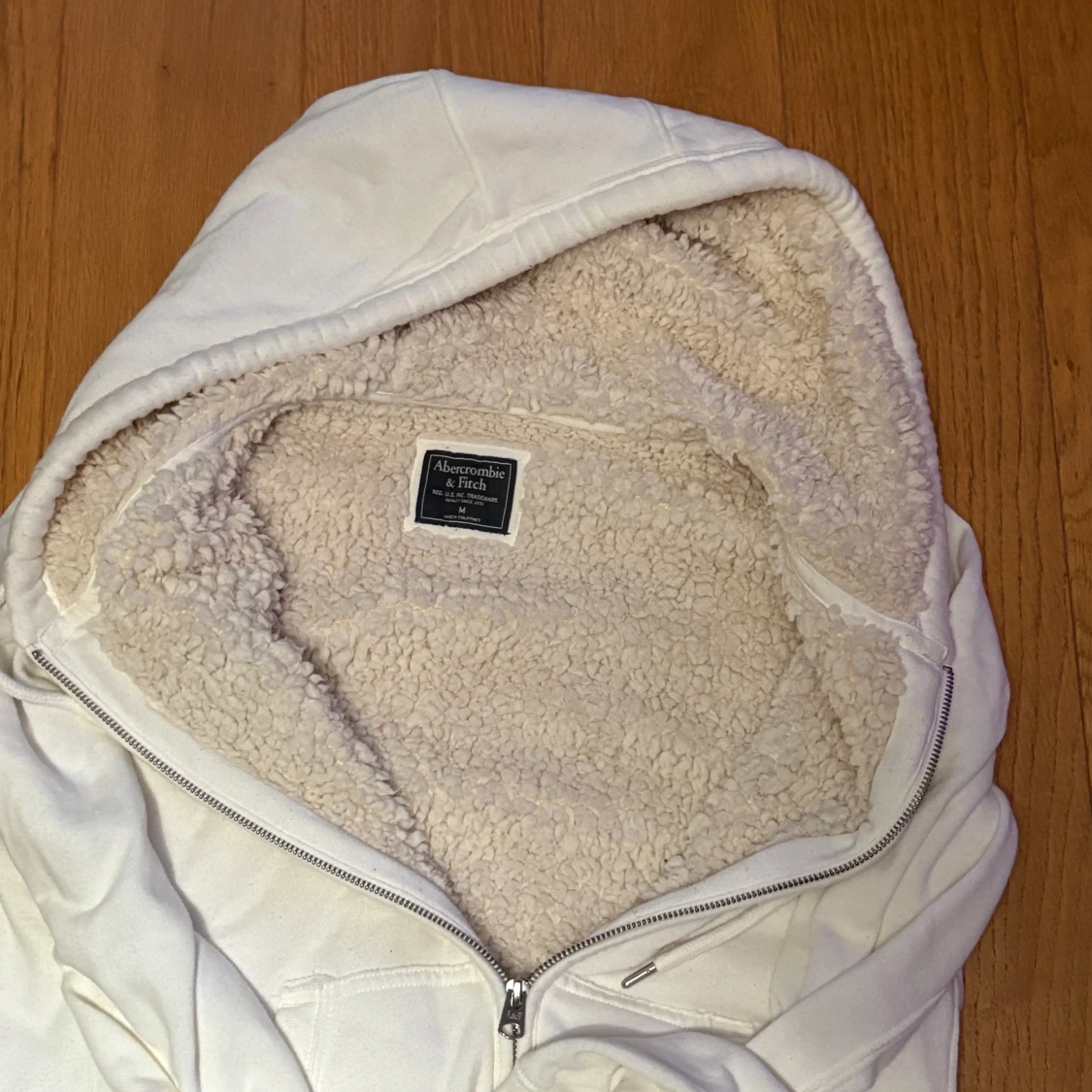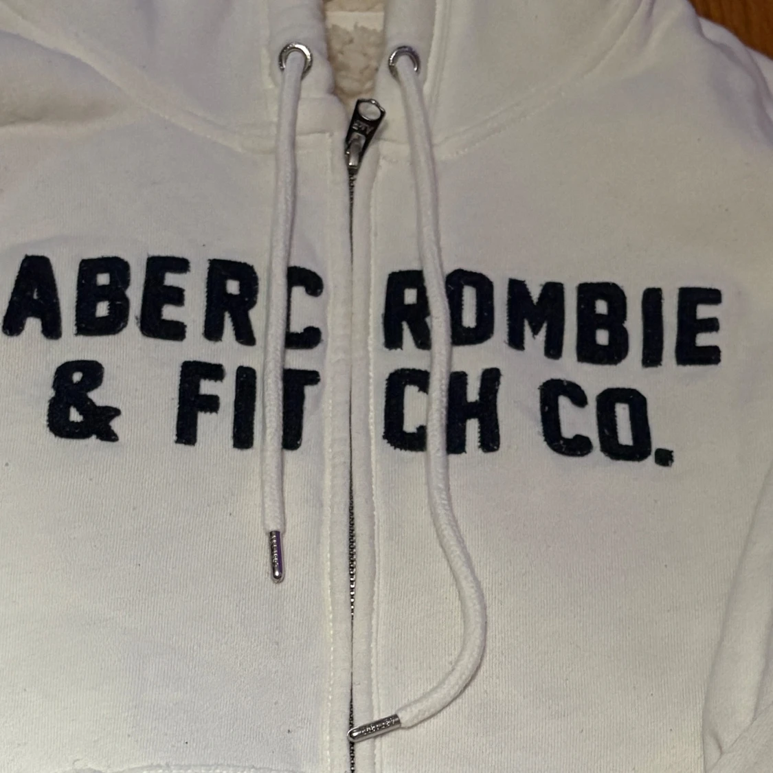 Mysig vit hoodie från Abercrombie & Fitch med svart logga framtill. Tröjan har dragkedja, snörning i huvan och fluffigt teddyfoder på insidan av huvan. Perfekt för kyliga dagar och har två fickor framtill. Lite liten i storleken. Priset kan självklart diskuteras bara o höra av dig!