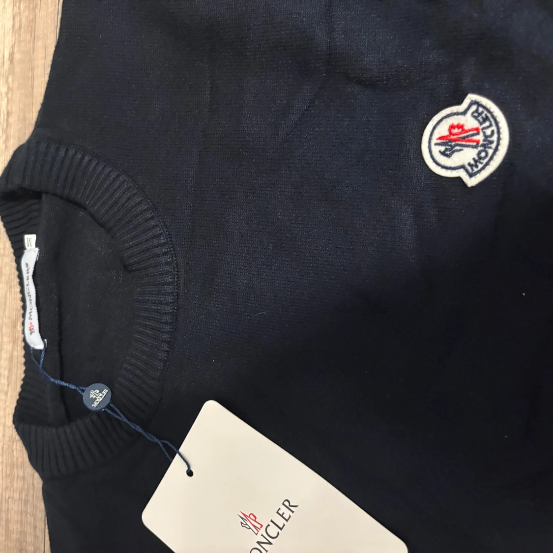Snygg mörkblå stickad tröja från Moncler med rund halsringning och diskret logga på bröstet. Tröjan har ribbade muddar vid ärmslut och nederkant samt långärmad passform. Perfekt för dig som gillar stilrena och exklusiva plagg. Passar S och M