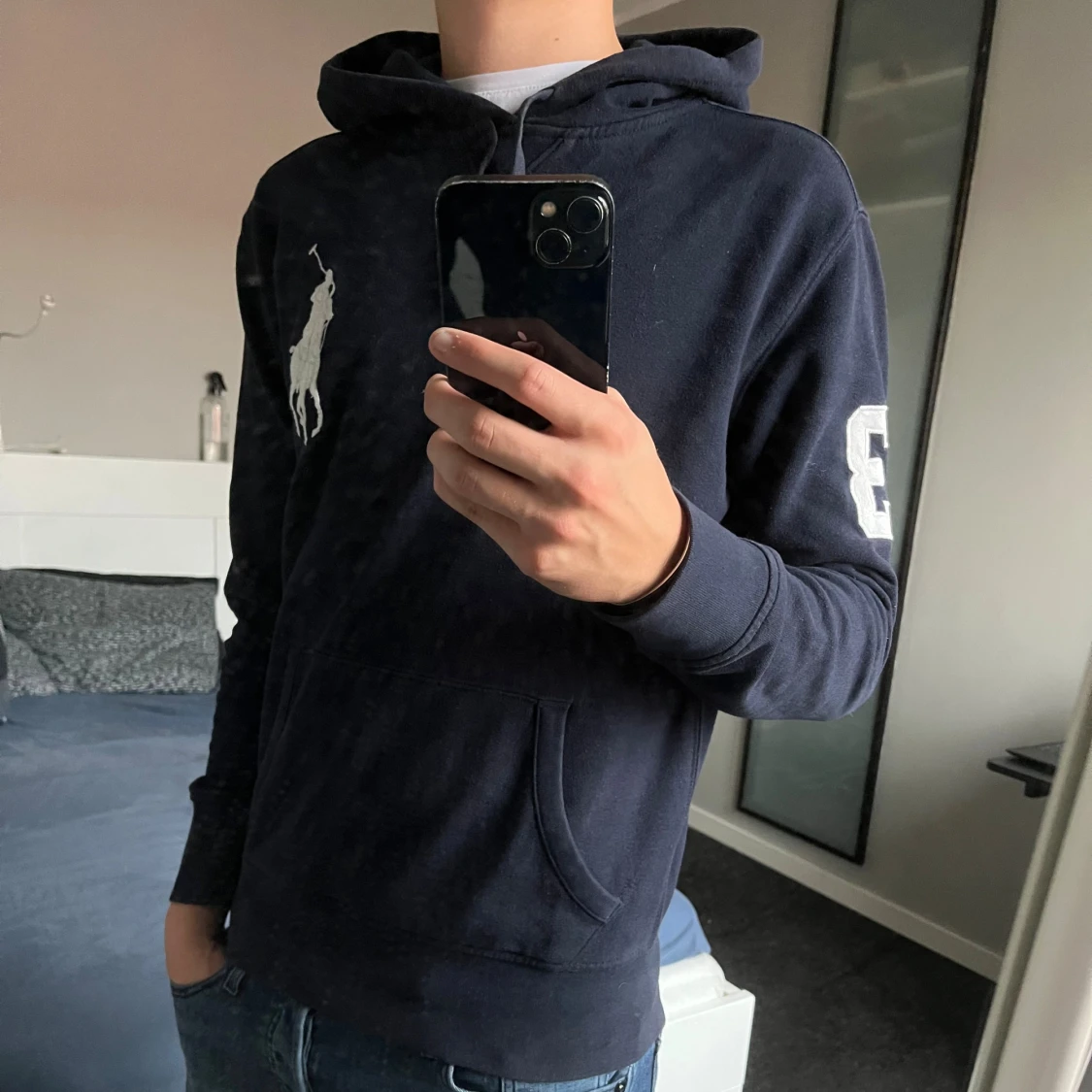 Mörkblå hoodie från Ralph Lauren med stor vit broderad logga på bröstet , huva med snörning och mjukt bomullsmaterial. Skick 9/10 varsamt använd. Skriv vid frågor! Inget pris satt!