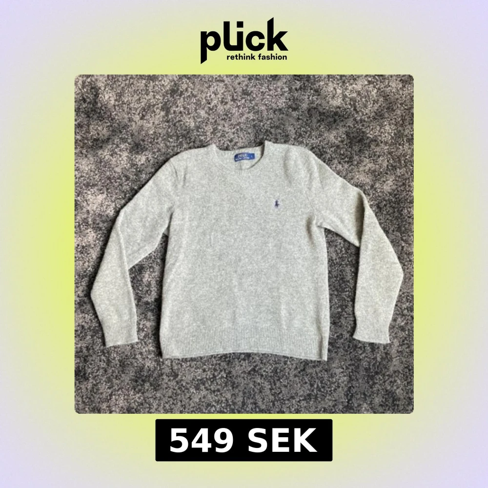 Klassisk grå stickad tröja från Polo Ralph lauren. Storleken är L men passar mer som en S-M. Hojta till om du har någon fråga!
