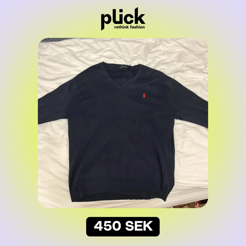 Säljer en snygg mörkblå tröja från Polo Ralph Lauren i Pima bomull. Den har en klassisk v-ringning och det ikoniska röda logotypbroderiet på bröstet. Perfekt för både vardag och lite finare tillfällen. Tröjan är i mycket bra skick och superbekväm att ha på sig.