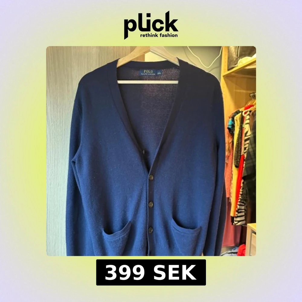 Klassisk marinblå kofta från Polo Ralph Lauren med v-ringning, knäppning framtill och två fickor. Mjukt material och snygga mockadetaljer på armbågarna. Perfekt för lager-på-lager och stilren look.