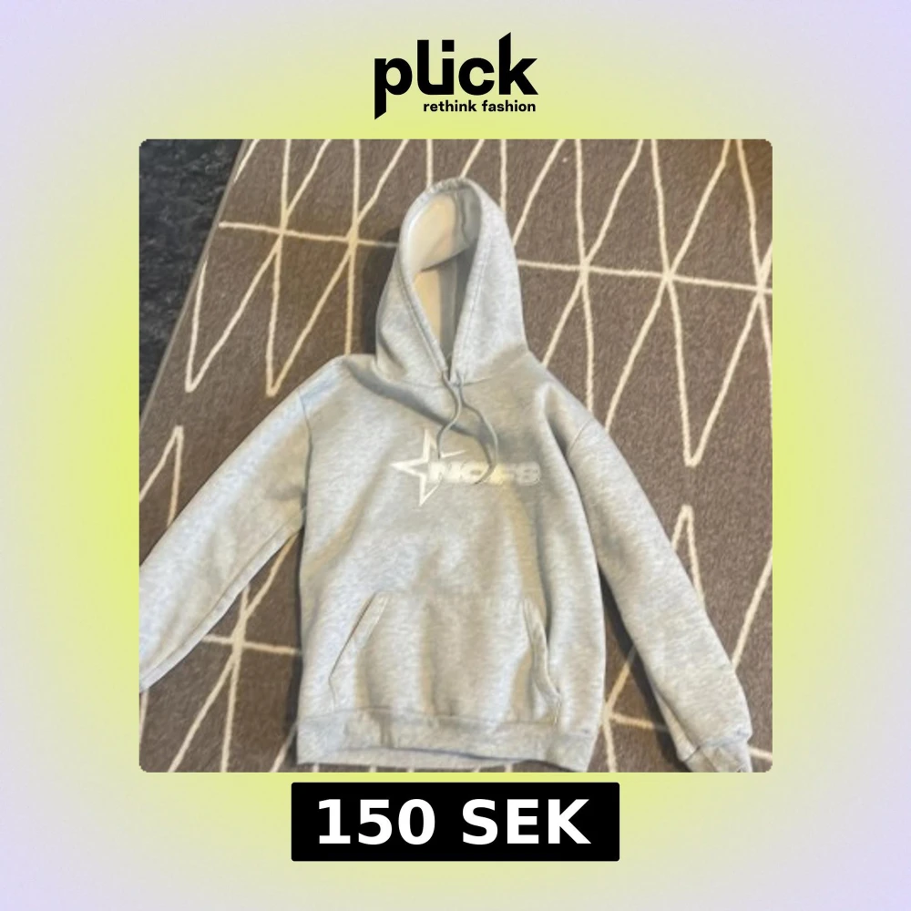 Säljer en grå hoodie med vit insida på huvan och ett tryck med stjärna och text på bröstet. Tröjan har magficka och dragsko i huvan. Perfekt för en avslappnad stil.