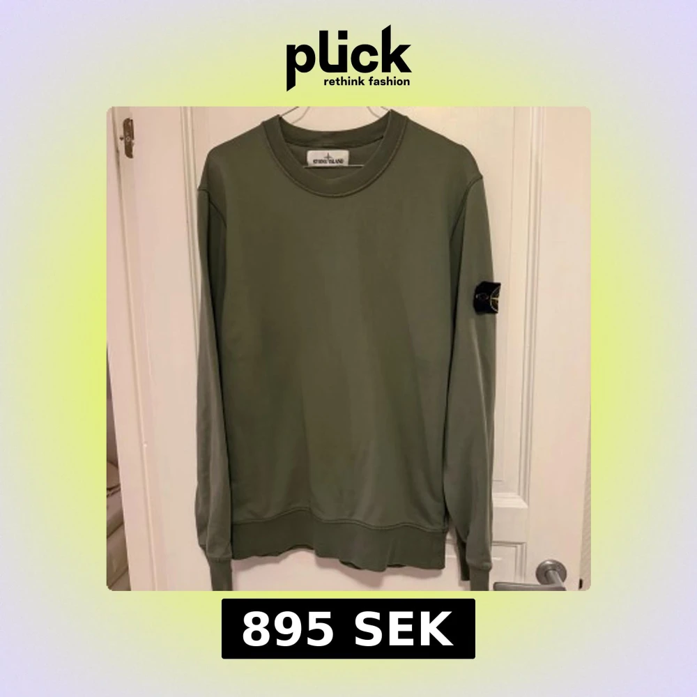 Säljer en olivgrön sweatshirt från Stone Island med klassisk rund hals och ikonisk logga på vänster ärm. Tröjan har en clean look, ribbade muddar och är perfekt för dig som gillar streetwear. Materialet är mjuk bomull och passformen är normal.