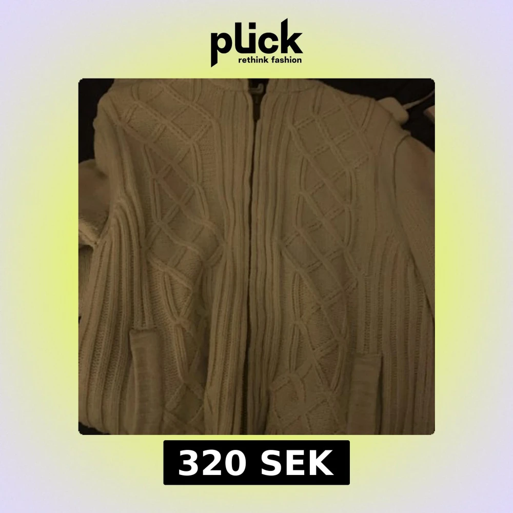 Säljer en vit stickad hoodie med dragkedja och fickor framtill. Tröjan har ett snyggt kabelstickat mönster på framsidan och ribbade detaljer på baksidan. Insidan av huvan har ett camouflagemönster som ger en cool kontrast.