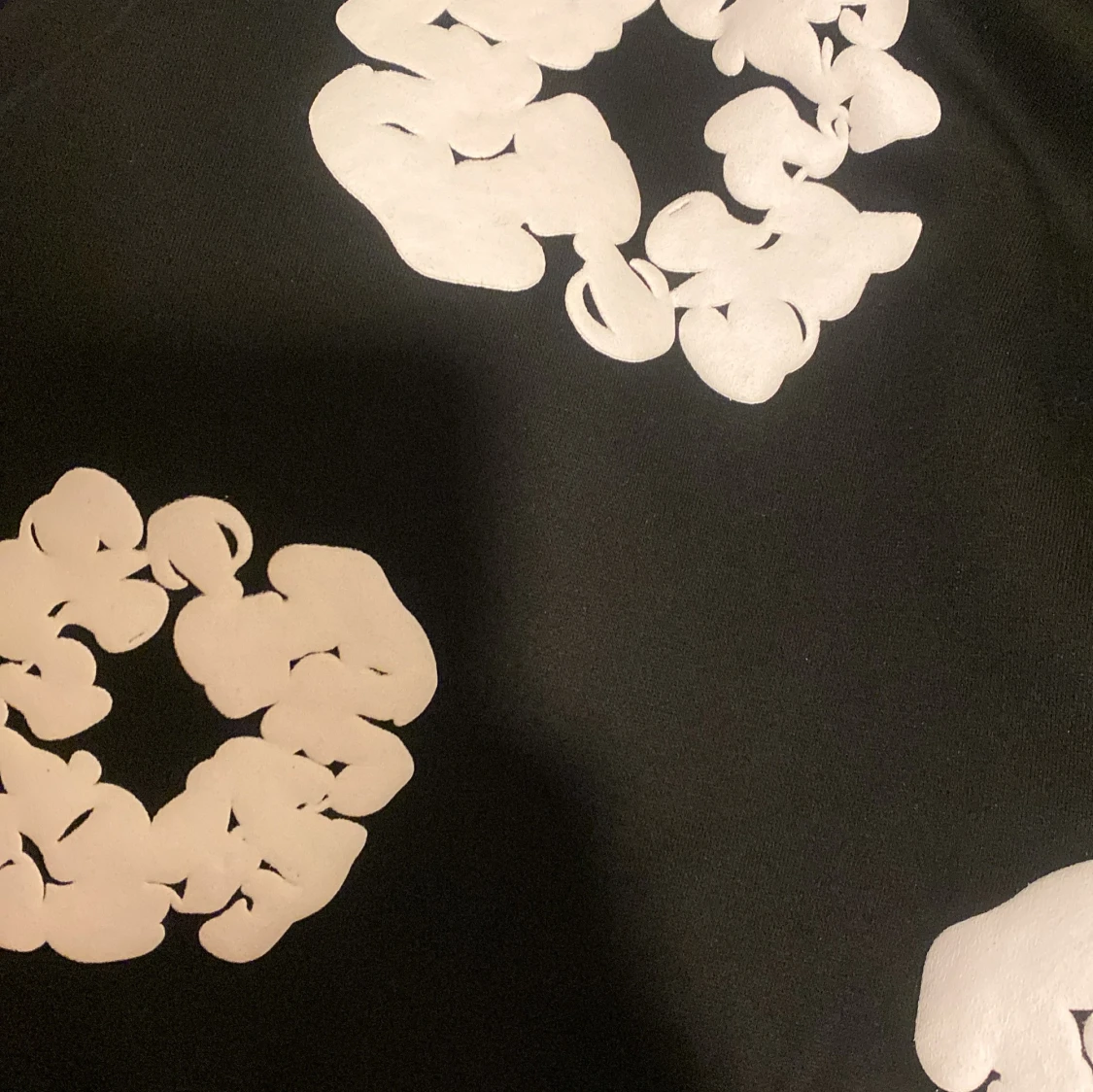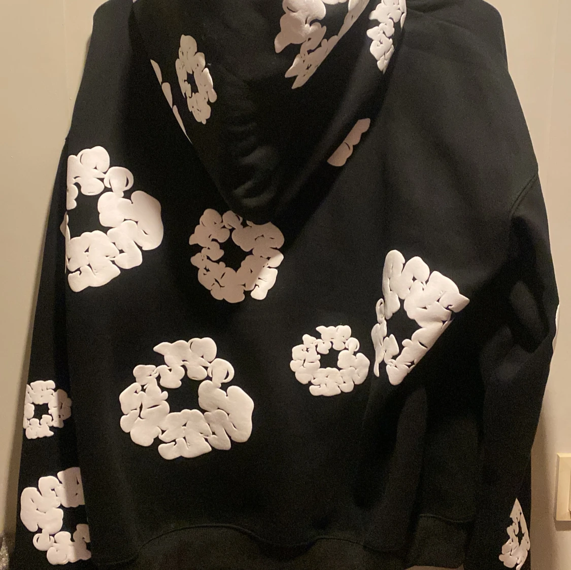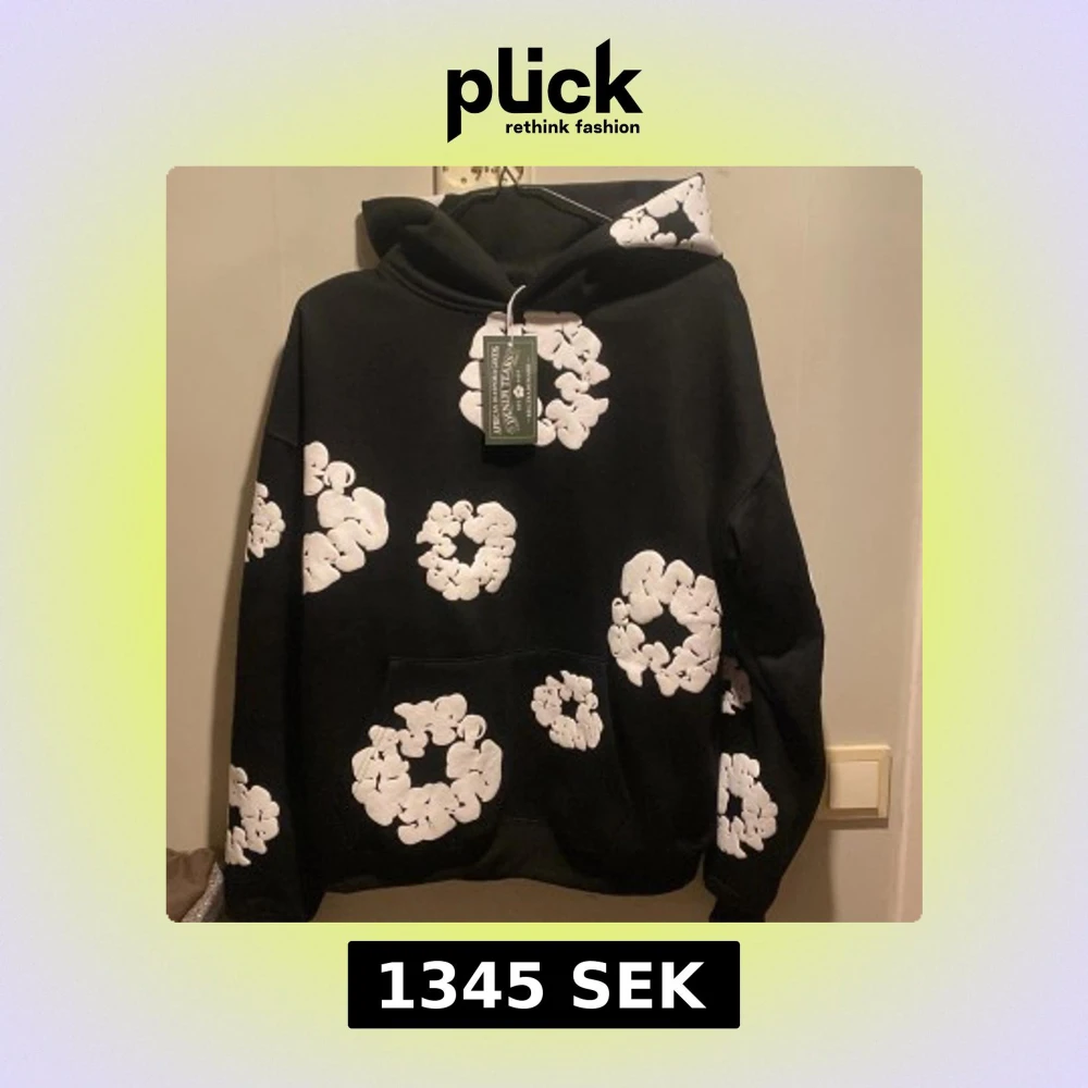 Säljer en cool svart hoodie från Denim Tears med unika vita mönster över hela tröjan. Den har en klassisk känguruficka och en bekväm huva. Perfekt för att sticka ut i mängden!