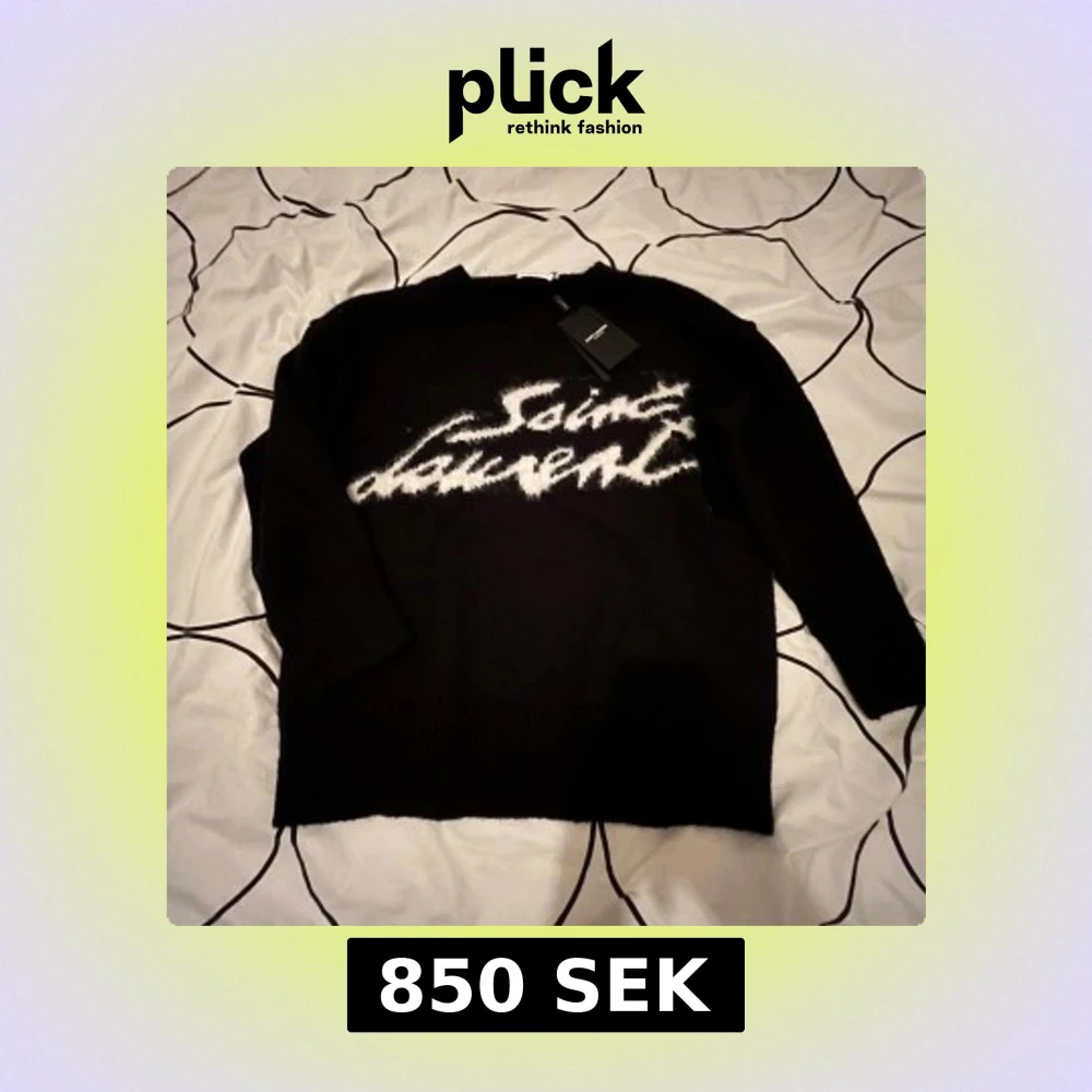 Säljer en stilren svart tröja från Saint Laurent med vit text på framsidan. Tröjan har långa ärmar och en klassisk passform. Perfekt för en trendig look.