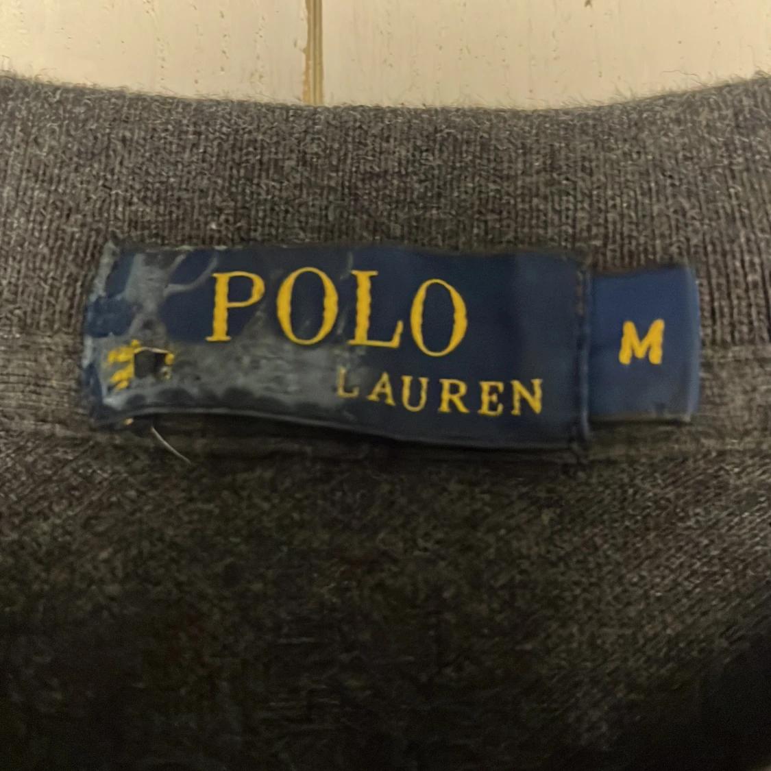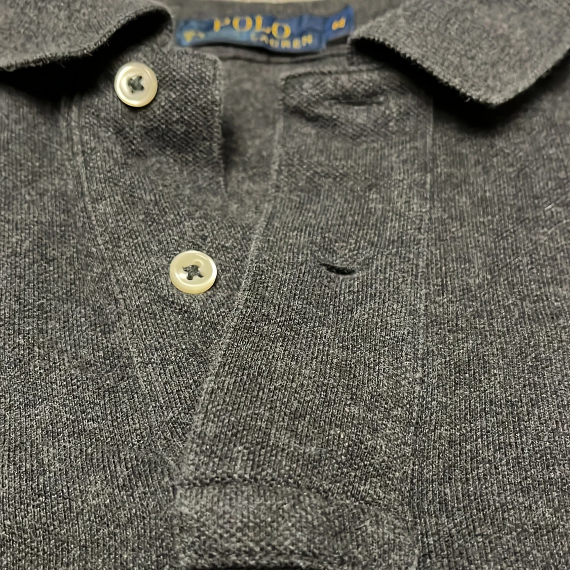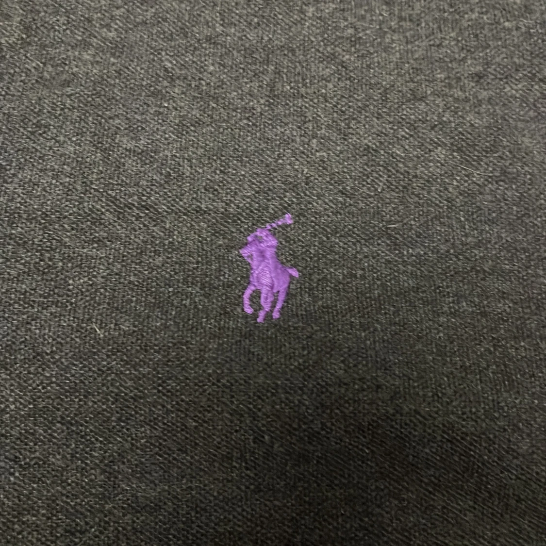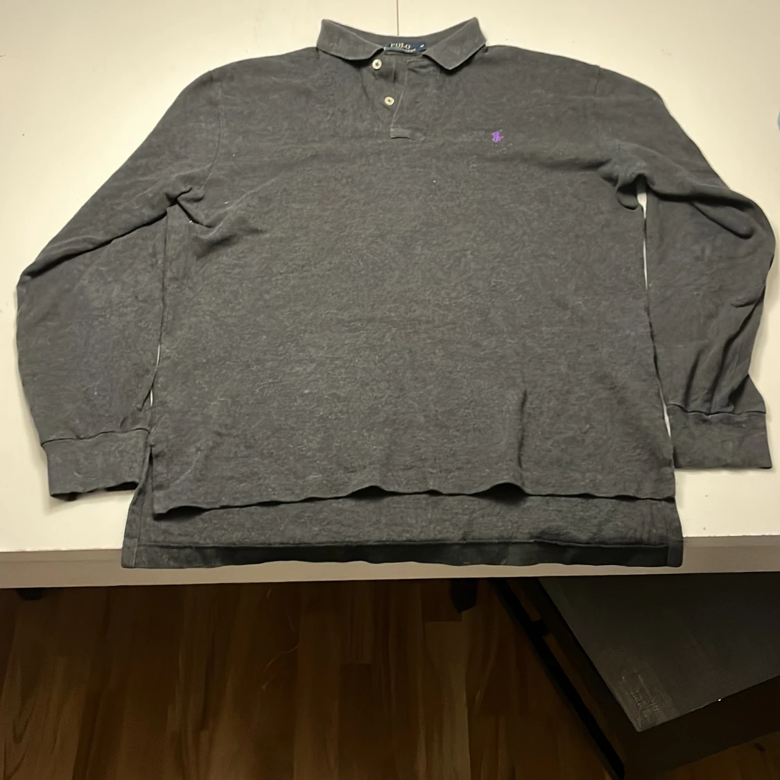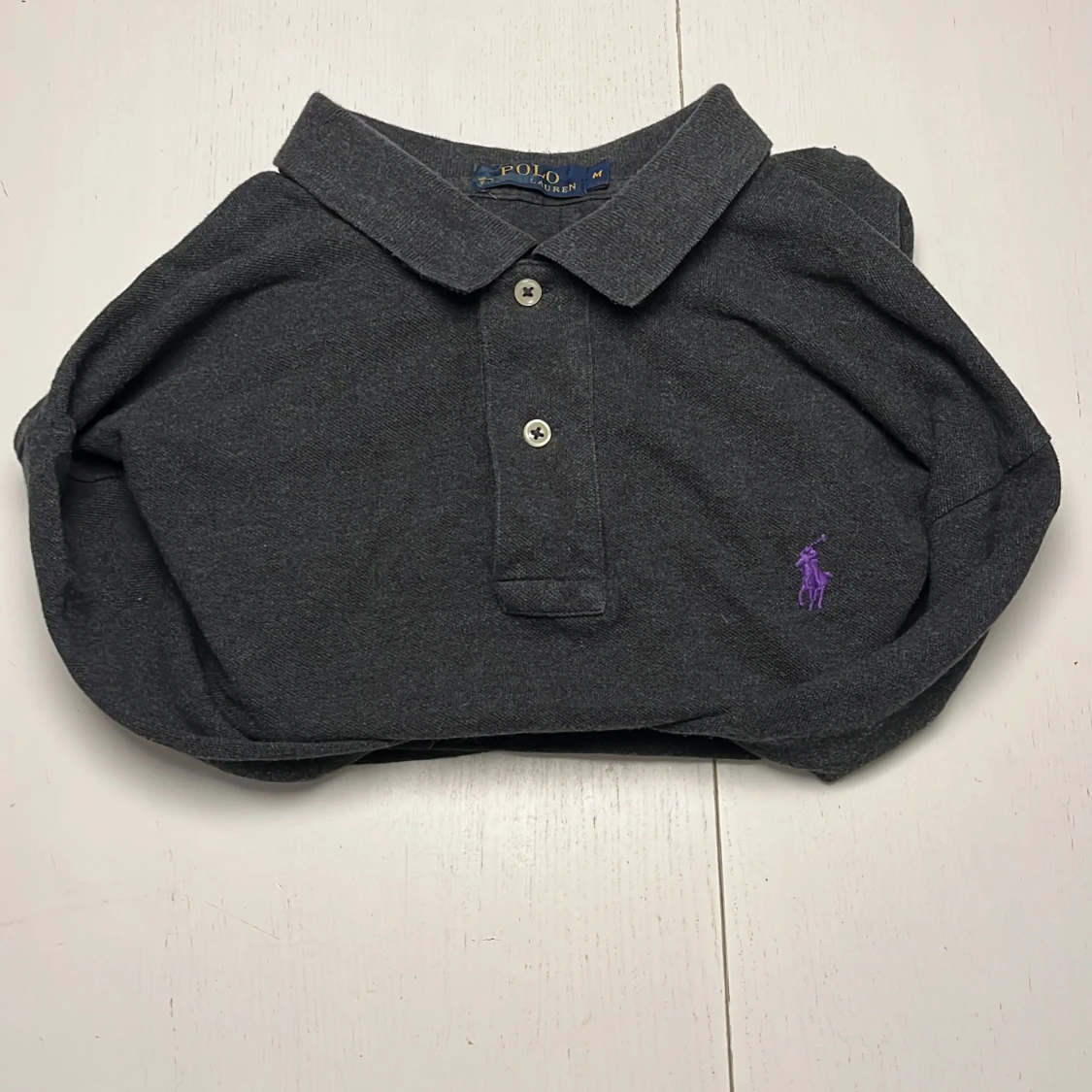 Säljer en klassisk grå pikétröja från Polo Ralph Lauren med lång ärm och knappar i halsen. Tröjan har en broderad lila logotyp på bröstet. Perfekt för en stilren look.