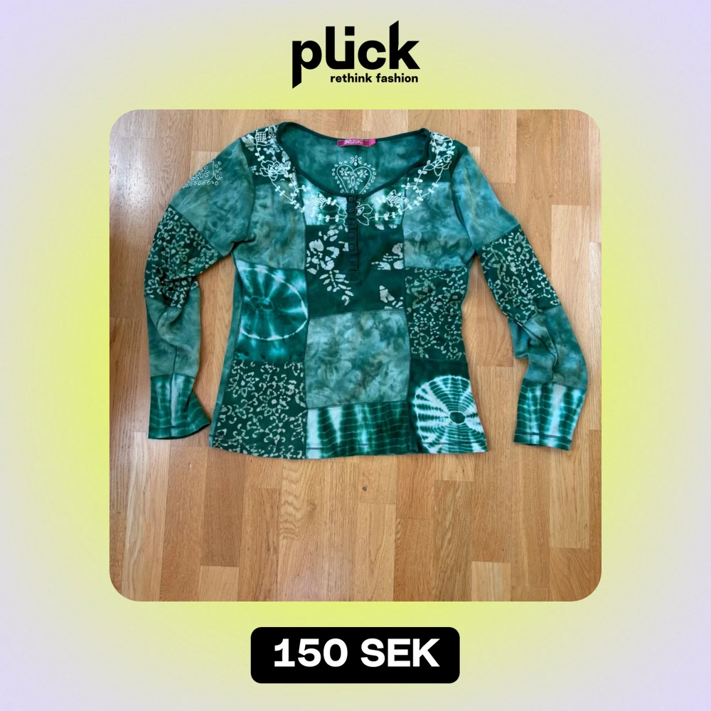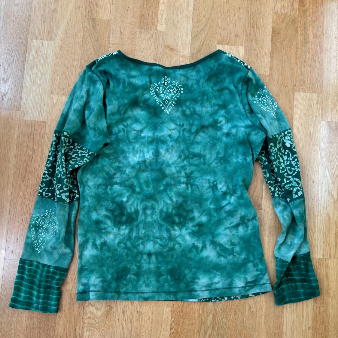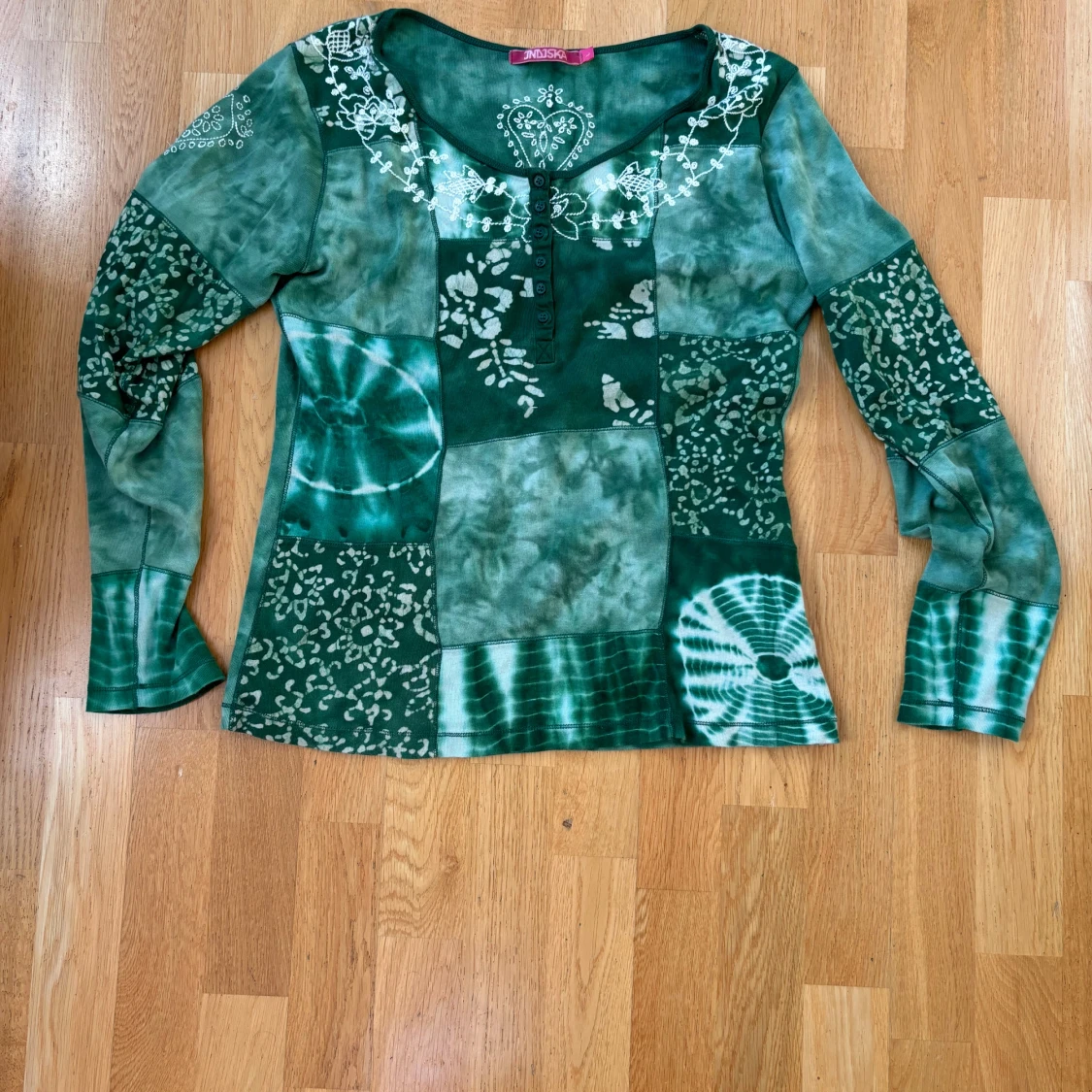 Jättefin tiedye aktig grön tröja med vita broderier.