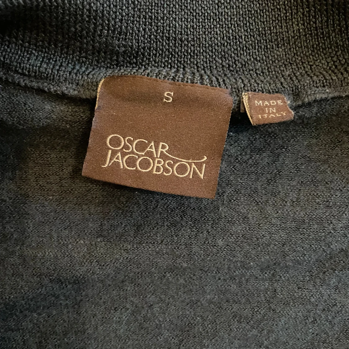 Grön/blå zip kofta från Oscar Jacobson med hel dragkedja framtill. Tillverkad i Italien och i ett mjukt, stickat material. Klassisk passform med långa ärmar och enkel design, perfekt att slänga på sig över en t-shirt.dne har tre skador so vissas på bilderna 😁