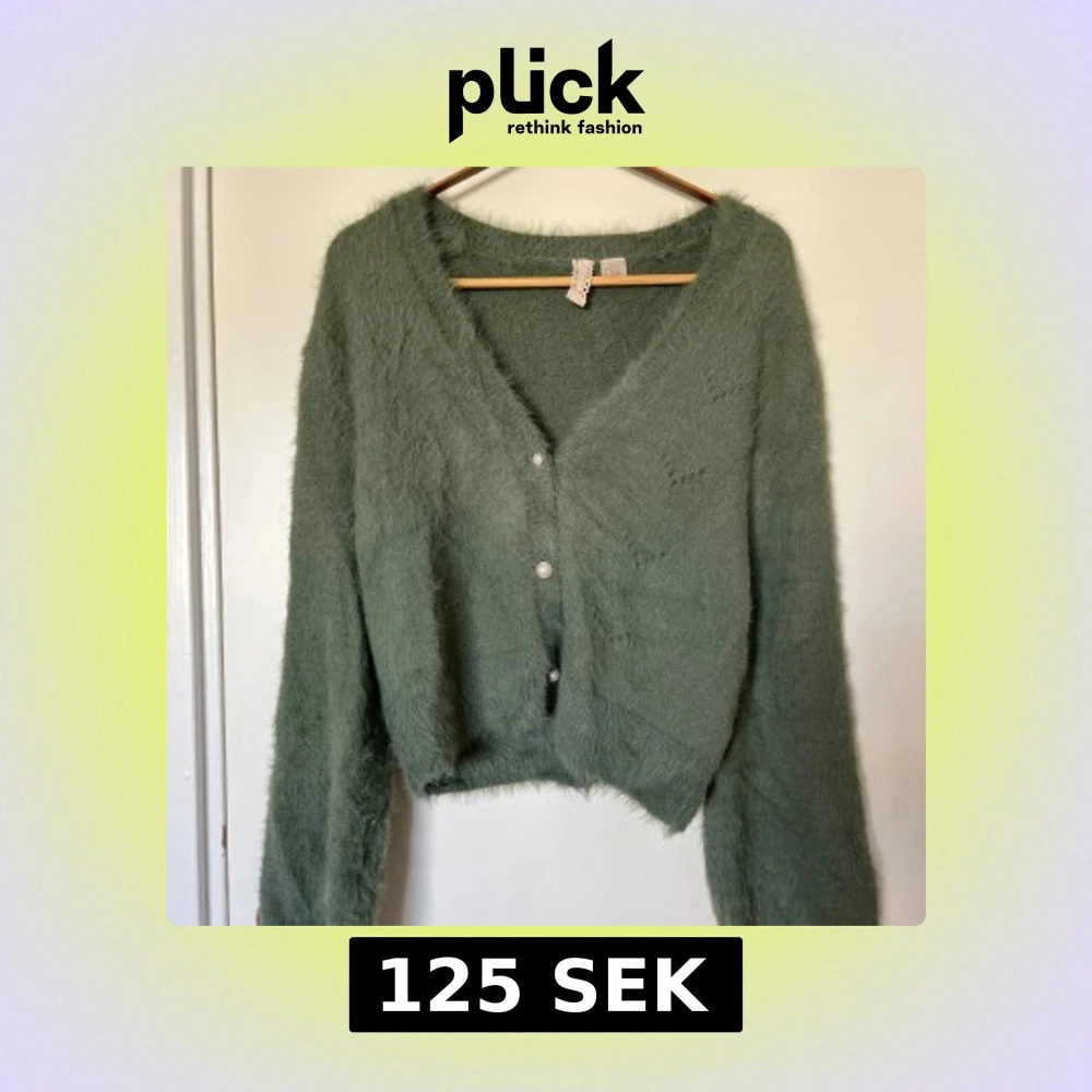 Supermjuk och fluffig grön kofta med v-ringning och pärlknappar framtill. Koftan har långa ballongärnar och är croppad i modellen. Jättefin till hösten! Passar s/m. Sparsamt använd.