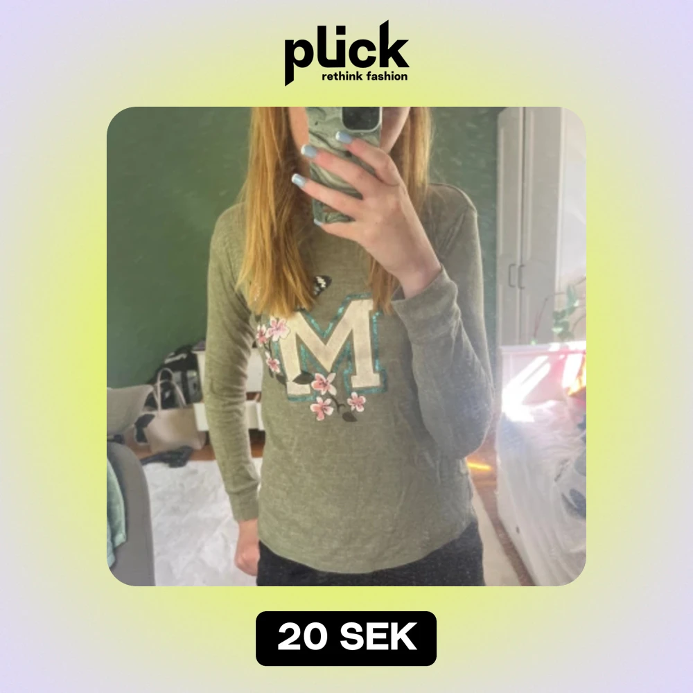Grön tröja med ett M i mitten och en luva. Den har nått tecken på användning och M:et är färgat lite lila därav priset 💜om det är nån fråga om pris eller något annat skriv till mig💖
