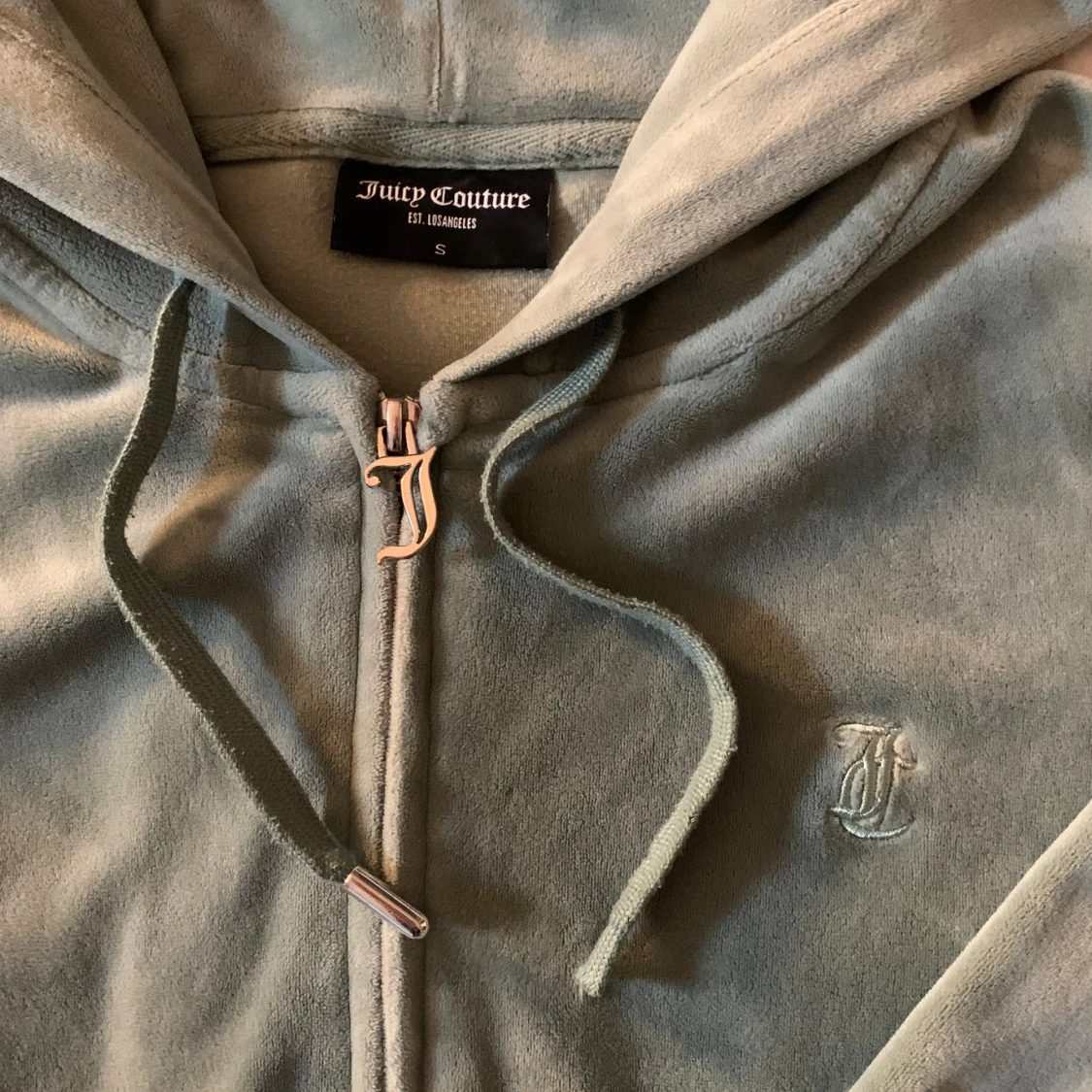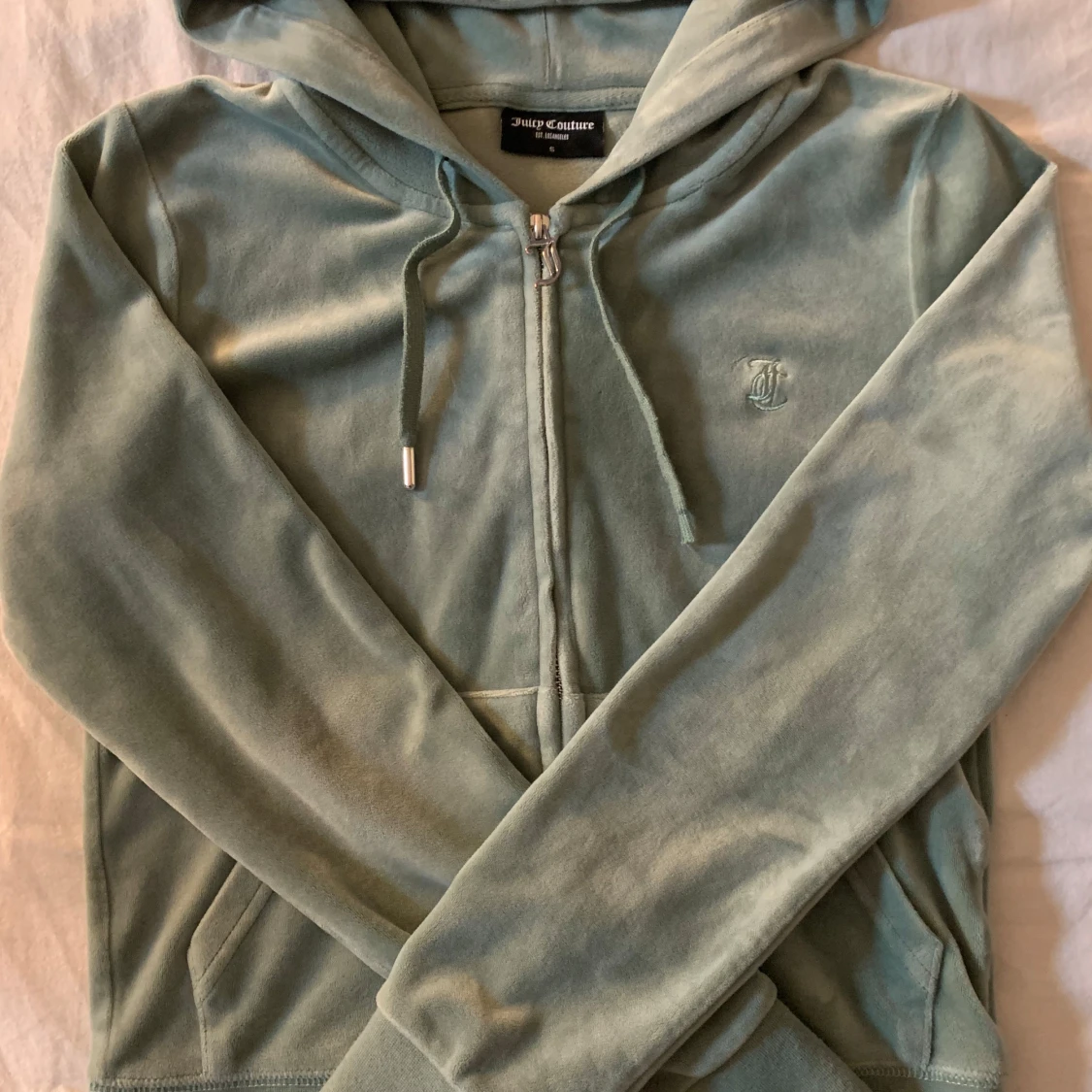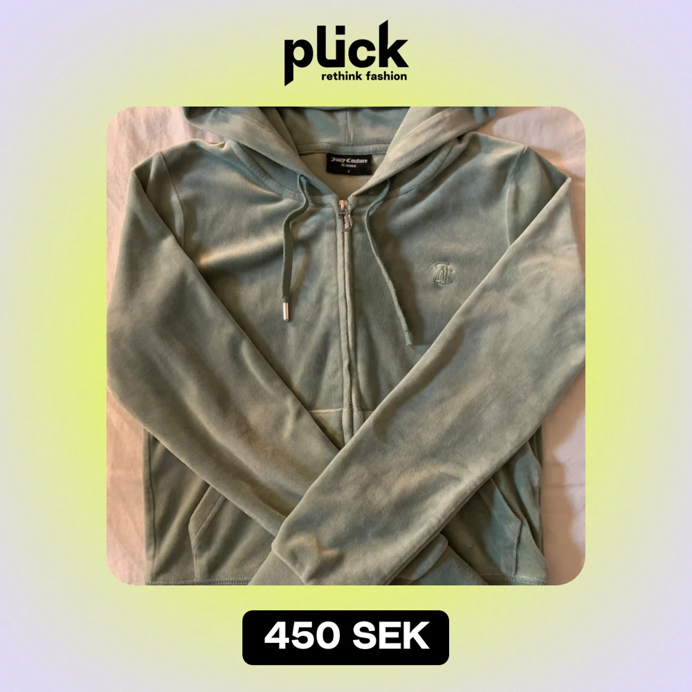 Mysig mintgrön hoodie från Juicy Couture. Den har en dragkedja framtill och en praktisk huva med snören. Som ni ser på bild 2 så e den ena metall biten tyvärr sönder på ena snöret därav priset. Nypris 1200.