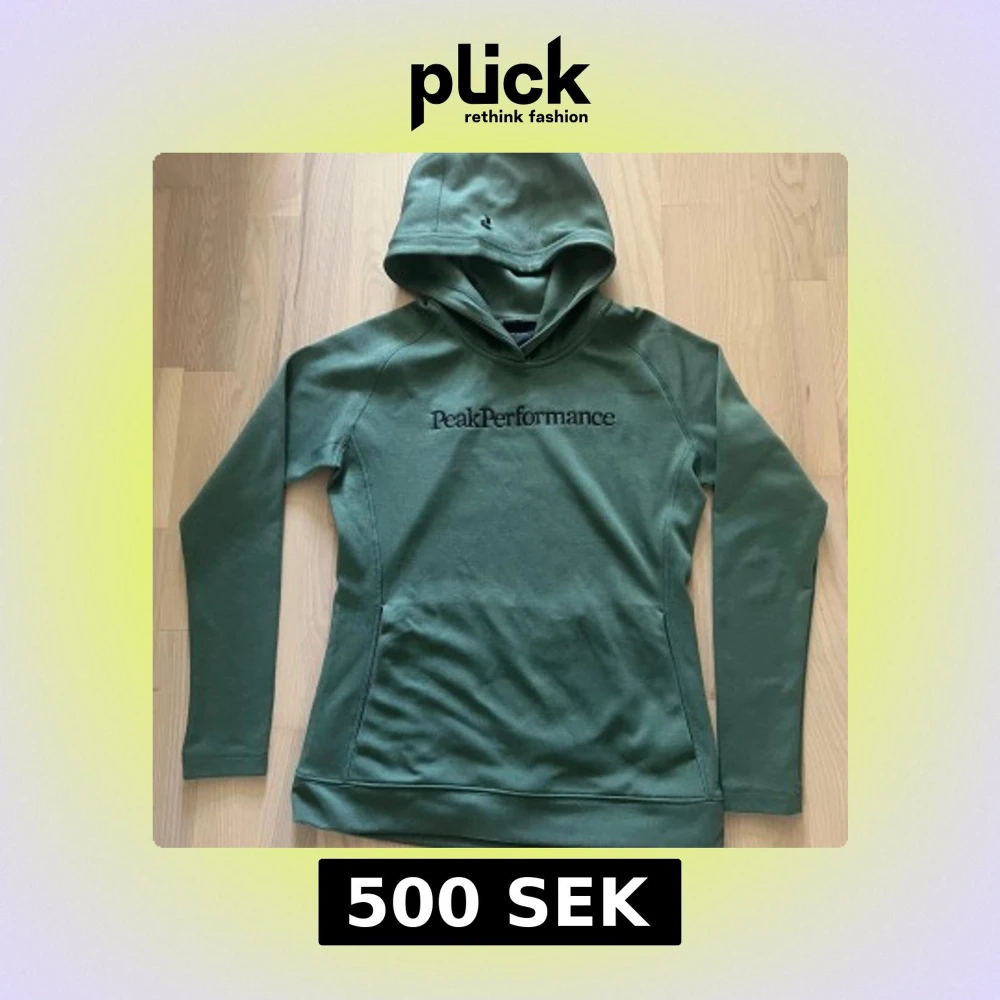 Säljer en snygg grön hoodie från Peak Performance. Tröjan har huva och lång ärm. Passformen är tajtare än en vanlig hoodie.