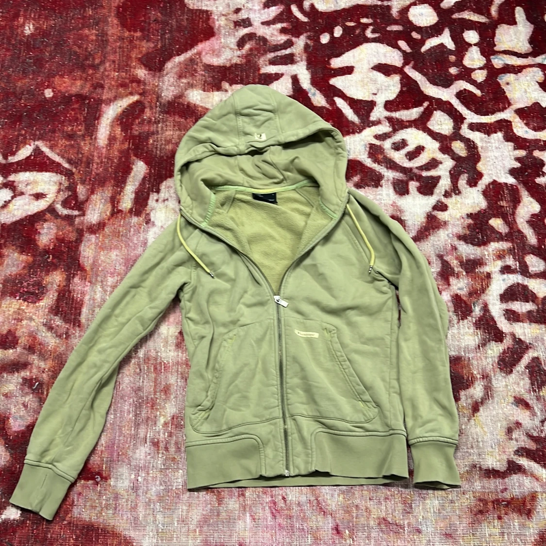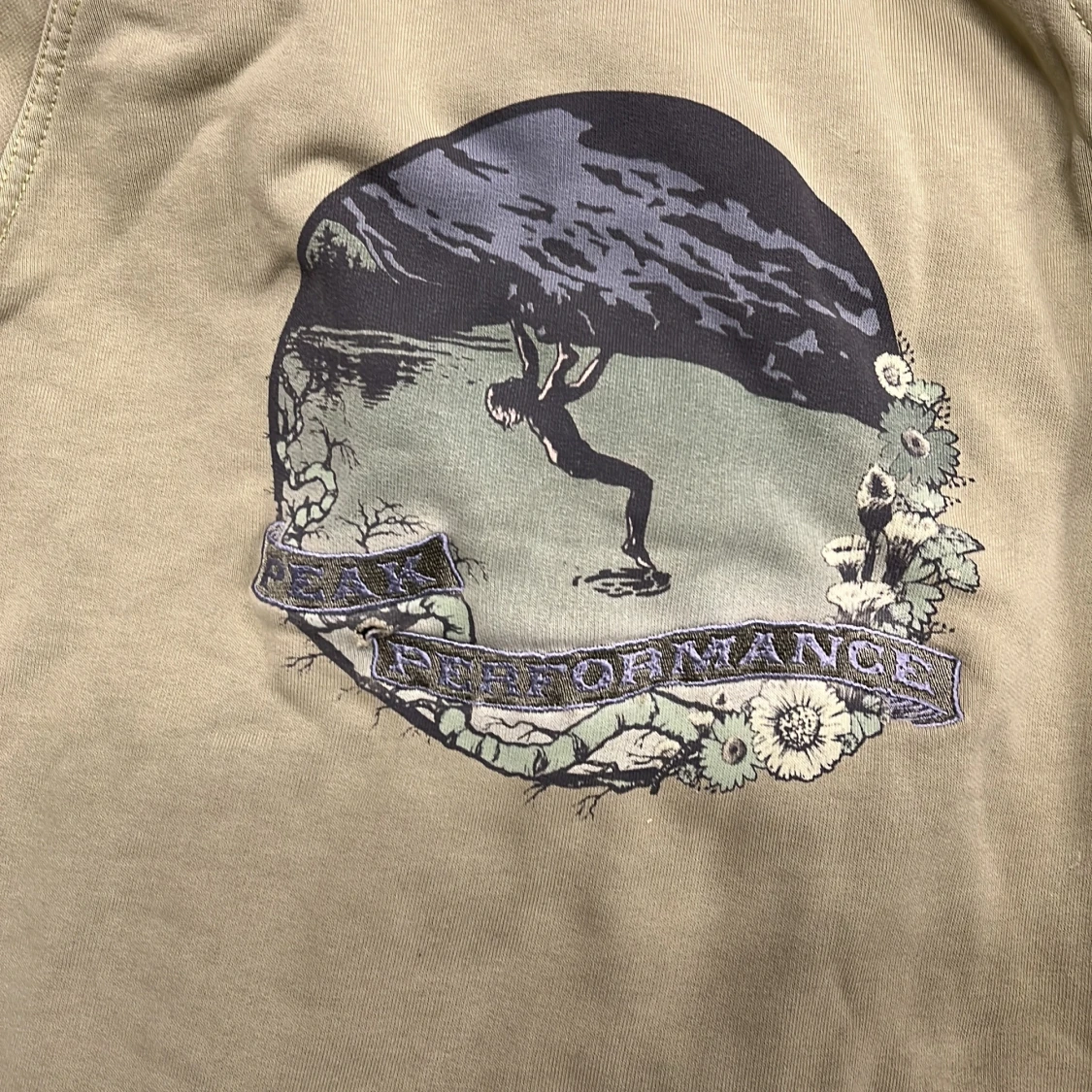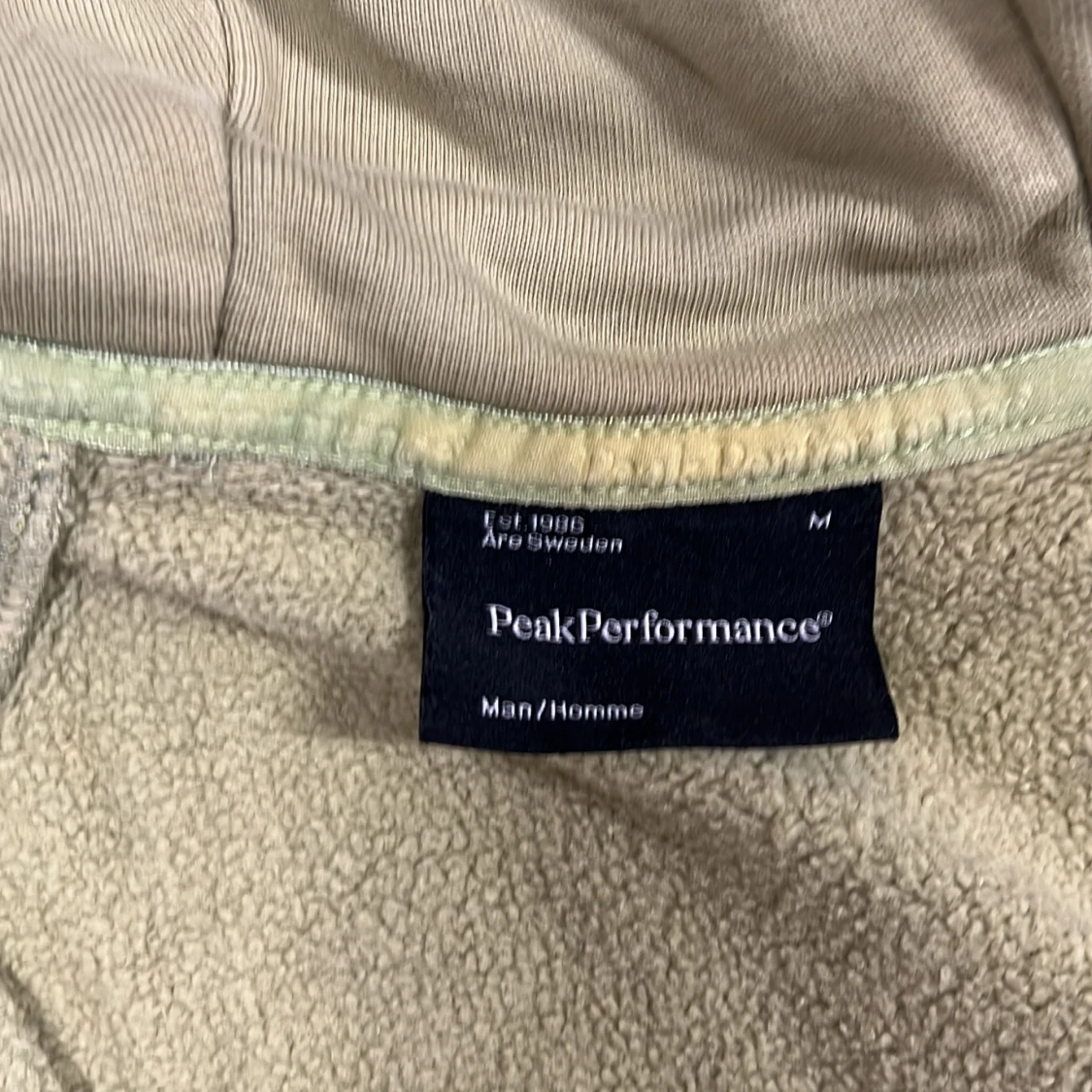 Snygg ljusgrön hoodie från Peak Performance med dragkedja och stor huva. Tröjan har ett unikt tryck och broderi på ryggen, samt praktiska fickor framtill. Mjuk insida i fleece och coola detaljer som snörning i huvan. Perfekt för chill dagar eller till träning. Ett litet hål på ryggen